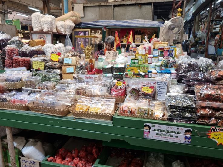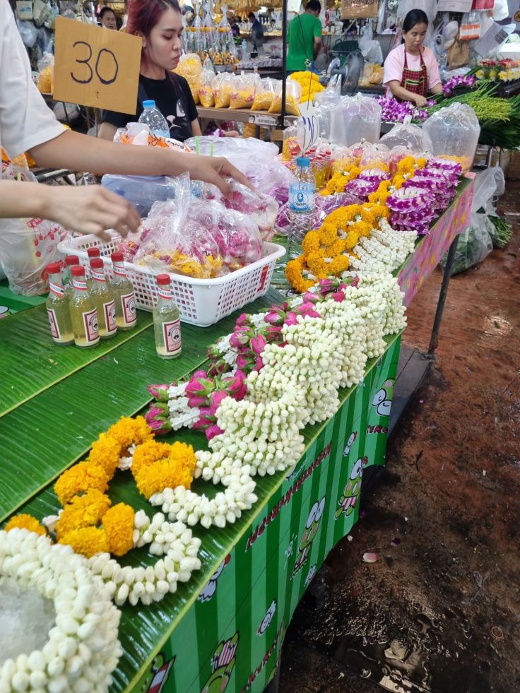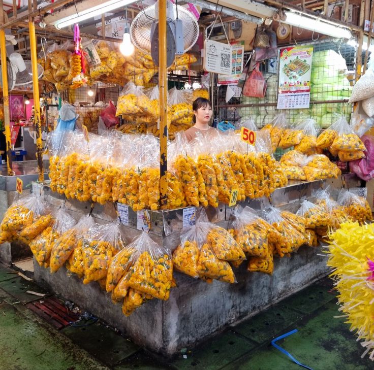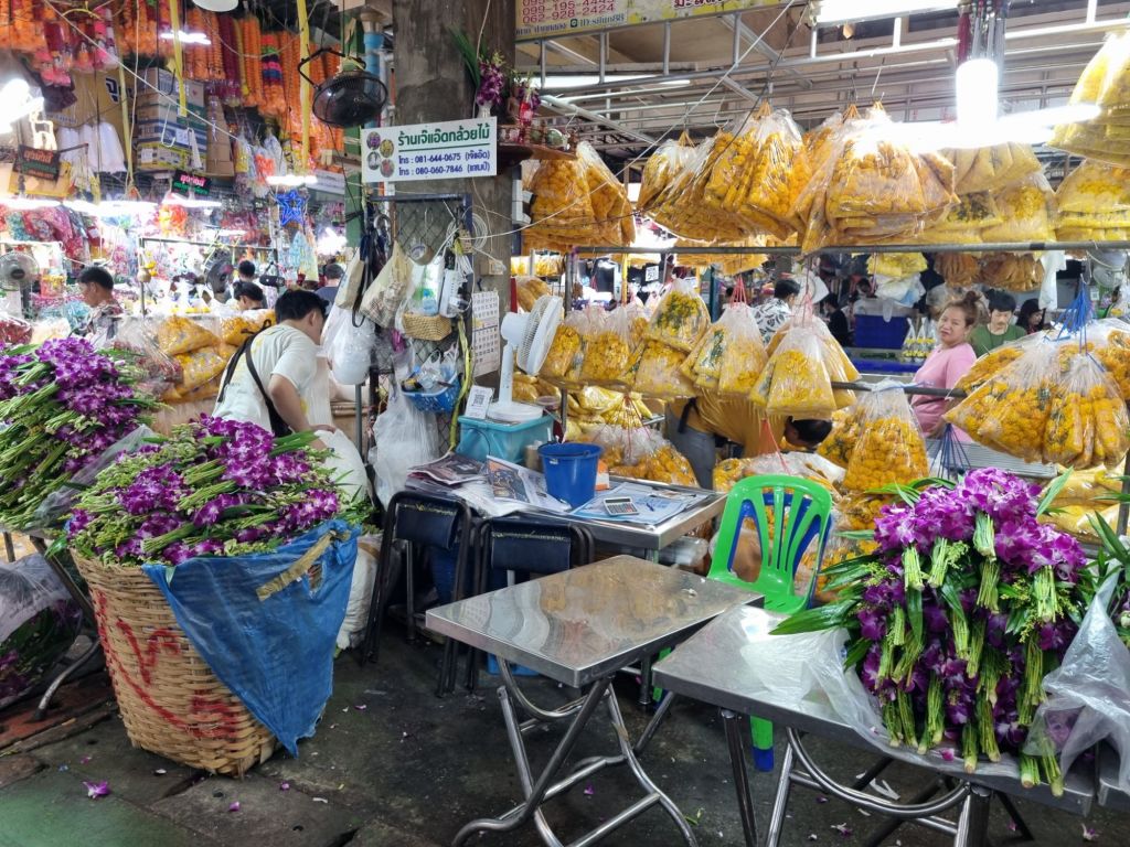 Südlich vom Wat Pho liegt eine weitere Attraktion der Stadt, die wir uns anschauen: der Blumenmarkt (Pak Khlong Talat). „Endlich mal ein Markt, der gut riecht“, urteilen unsere Mädels über diese bunte Pracht, die teils als Opfergabe für den Tempel und teils wie bei uns als Dekoration dient. Direkt hinter dem Blumenmarkt folgt ein Markt mit Obst und Gemüse und schließlich auch einer mit allerlei Heilkräutern, Arzneien und Gewürzen.