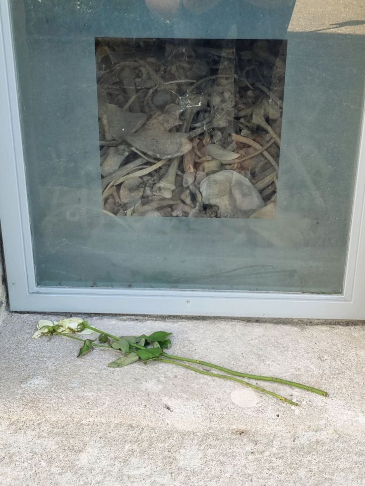 Im Gebäude befinden sich ein Kino, eine Kapelle und eine Gedenkhalle (in der nicht fotografiert werden darf) und man kann auf den Turm steigen. Unter dem Gebäude sind die Gebeine der Gefallenen aufgeschichtet, über mehrere Fenster können wir in das Innere des Beinhauses blicken. Vor dem Gebäude befindet sich ein Friedhof für französische Soldaten, rechts und links Gedenkstätten für jüdische und muslimische Soldaten.