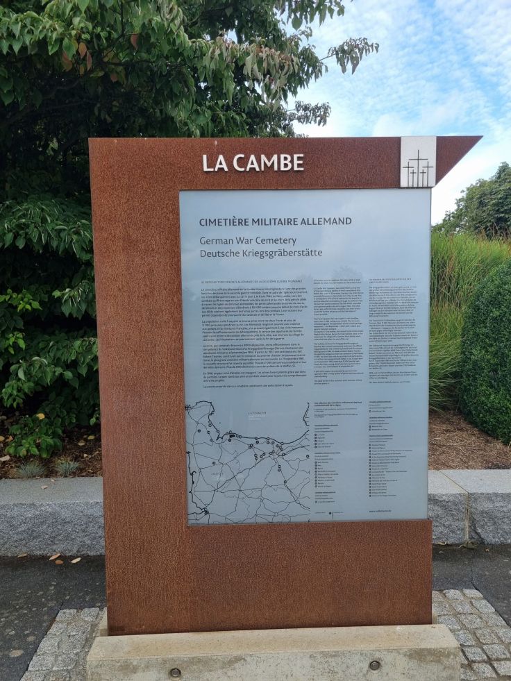 Nächste Station ist La Cambe, mit über 20.000 Bestatteten die größte deutsche Kriegsgräberstätte in der Normandie (kostenlose Parkplätze vorhanden). Da die Toten größtenteils in Gemeinschaftsgräbern liegen, ist diese Zahl in der Anlage nicht wirklich ersichtlich. Im Informationszentrum dokumentiert eine Ausstellung beispielhaft, was die Menschen im Krieg erleiden mussten. Sie beschreibt Schicksale von Menschen verschiedener Nationalitäten aus verschiedenen Blickwinkeln, von Tätern und von Opfern, und stellt Beispiele für Hoffnung und Versöhnung heraus. Diesen Gedanken zeigt auch die Einbettung der Anlage in einen Friedenspark aus zahlreichen Ahornbäumen sowie ein Zitat von Albert Schweitzer auf einem Gedenkstein: „Kriegsgräber sind die großen Prediger des Friedens.“