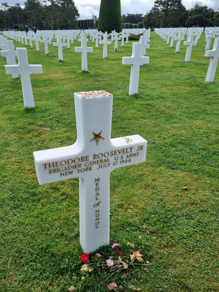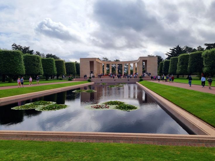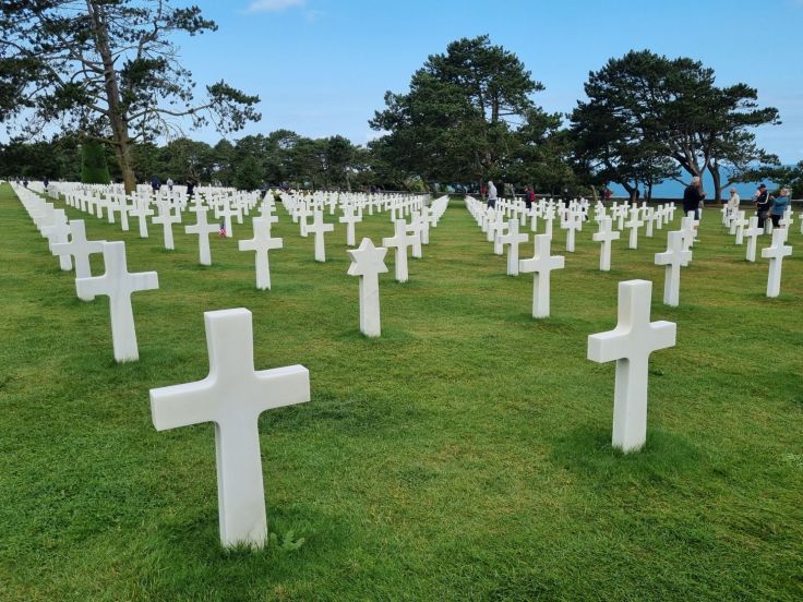 Den Angriff über das Wasser schildert sehr grausam und einprägsam der Film „Soldat James Ryan“ mit Tom Hanks, den wir im Vorfeld mit den Töchtern angeschaut hatten. Die Anfangsszene des Films spielt Jahrzehnte nach dem D-Day auf der amerikanischen Gedenkstätte in Colleville-sur-Mer, die wir aus dem Osten kommend als erstes besuchen (riesige Gratisparkplätze vorhanden). Am Beginn des Memorials steht eine Gedenkstätte, in der unter anderem auf die reale Vorlage für „James Ryan“ verwiesen wird. Der detaillierte Ablauf des D-Day wird, sowohl zeitlich als auch mit verschiedenen Augenzeugenberichten, Zitaten und Exponaten, dargestellt. Der Rundgang wird fortgesetzt mit Aussichtspunkten über Omaha Beach und den Ärmelkanal bis hin zum Friedhof mit den Gräbern, teils mit Namen, teils der namenlosen Soldaten, meist mit Kreuzen, wenige mit Davidsternen (insgesamt fast 10.000 Gräber). Am einen Ende der Gräberreihe steht eine Kapelle, am anderen ein Ehrenmal.