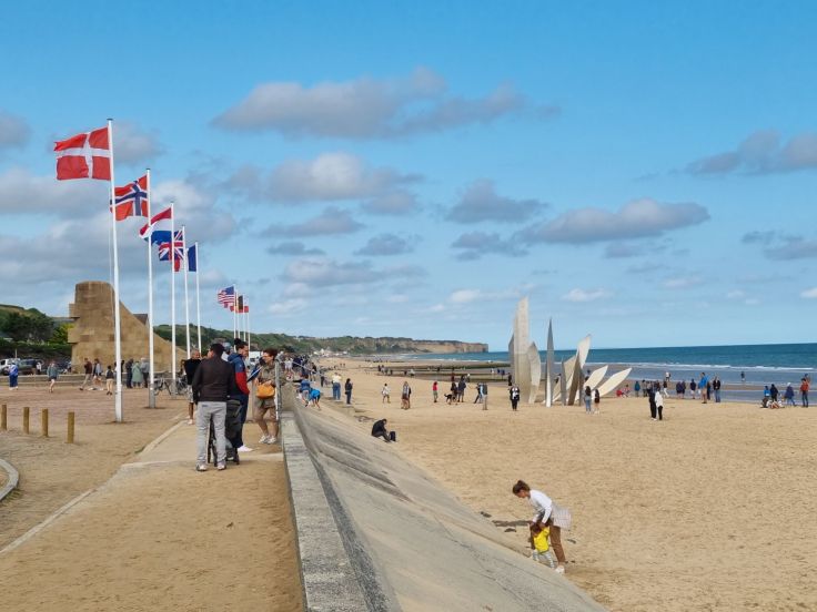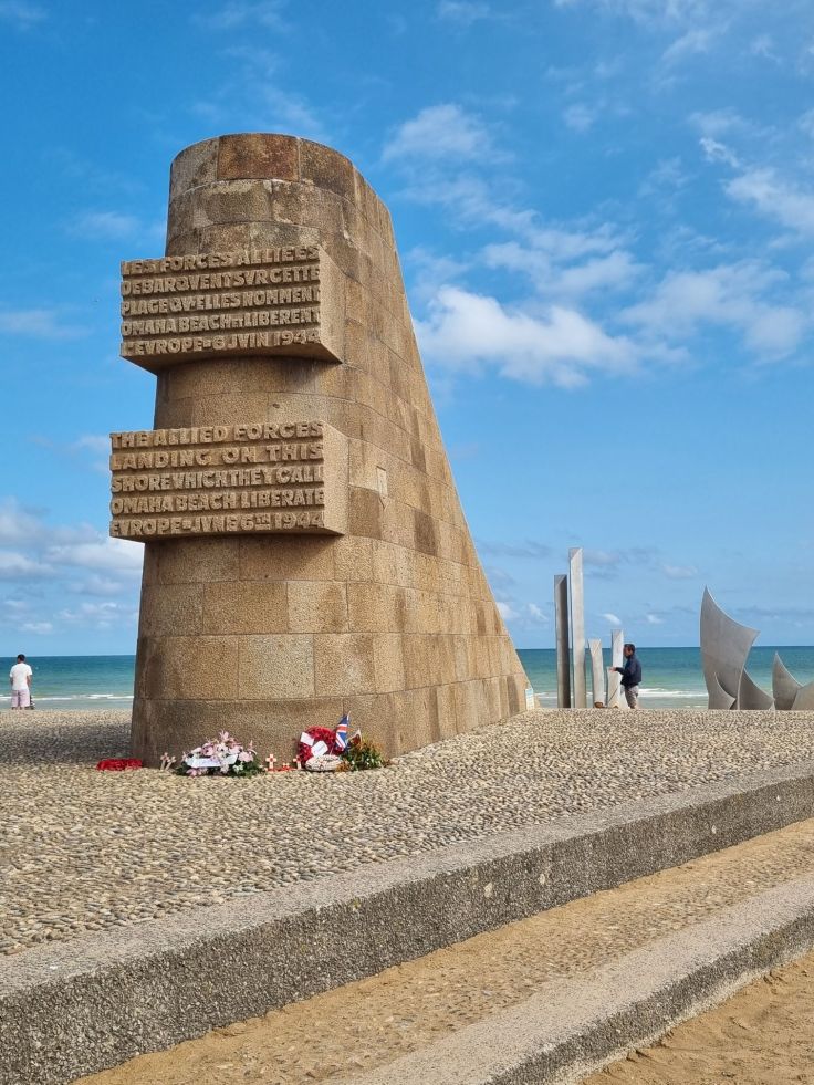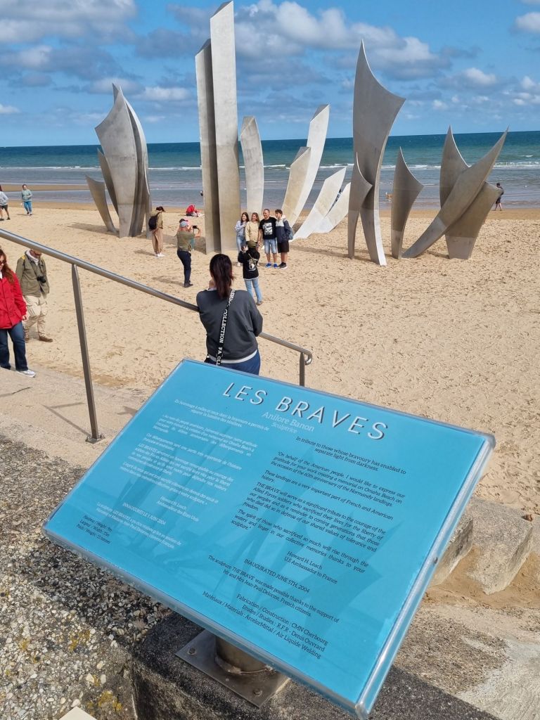 Direkt zum Strand kann man von hier aus nicht, dies ist möglich in unmittelbarer Nähe am Omaha Beach Memorial (Bezahlparkplatz vorhanden). Herzstück des Memorials ist das „Les Braves Omaha Beach Memorial„, das sich aus drei Elementen zusammensetzt: „The Wings of Hope“ (Flügel der Hoffnung), „Rise, Freedom!“ (Erhebe dich, Freiheit!) und „The Wings of Fraternity“ (Flügel der Brüderlichkeit) – anlässlich der kürzlich erfolgten 80-Jahr-Feiern rund um den D-Day war es des Öfteren in den Nachrichten zu sehen. Am Memorial selbst ist einiges los, wenige Meter rechts und links der Gedenkstätte kaum noch etwas. Der Strandabschnitt hier ist wunderschön, an einigen Stellen baden Urlauber. Ich finde es schwierig, diese Gegensätze zwischen landschaftlicher Schönheit und Urlaubsfreunden und der blutigen Vergangenheit rund um den „längsten Tag“ auszuhalten. Am D-Day sind insgesamt etwa 4.500 Soldaten gestorben, alleine 2.000 am Omaha Beach.