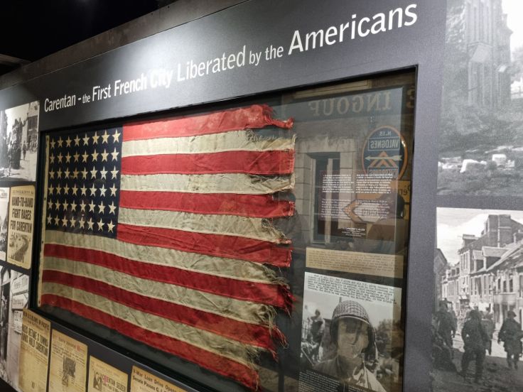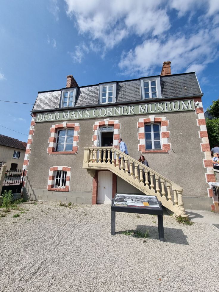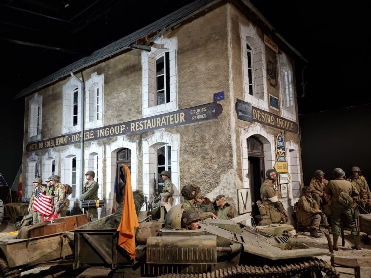 Unsere letzte Station ist das D-Day Experience Museum in Saint-Come-du-Mont. Zahlreiche große und kleine Museen konkurrieren an diesem Küstenabschnitt um Besucher, viele sind nur ein Sammelsurium diverser Militaria, was ich nicht besonders spannend finde (und die Kinder noch weniger). Gerade unserer Töchter wegen standen für uns zwei Einrichtungen zur Wahl: dieses und das Arromanches 360 – das wir aus räumlichen Gründen (es liegt im Osten beim britischen Landungsstrand) jedoch verwarfen. Die „D-Day Experience“ besteht aus drei Bausteinen: einem 3-D-Film (Audioguide auch auf Deutsch), einem Flugsimulator und einem Museum, wir entscheiden uns für alle drei. Der Film besteht aus zwei Teilen, einer dreht sich um den D-Day und der zweite um die Ereignisse in den Tagen danach rund um das benachbarte Carentan, das am 12. Juni 1944 als erste französische Stadt von den Alliierten befreit wurde (in beiden Filmen wird kein Blutvergießen gezeigt, also auch für Kinder ab einem gewissen Alter tauglich). Ein Teil des Museums ist das historische, nahezu unveränderte und damals von den deutschen Fallschirmjägern besetzte Gebäude am „Dead Man’s Corner“ (hier leider auch das typische Militaria-Sammelsurium, auch käuflich zu erwerben), der andere zeigt die alliierte Seite. Beim Flugsimulator wird nach einer Einführung durch einen Offizier der Flug über den Ärmelkanal nachempfunden. Würde ich den Besuch empfehlen? Ja, trotz des recht hohen Preises, denn ich glaube, dass das „Gesamtpaket“ vor allem durch den Film und Flugsimulator (Stichwort „Infotainment“) dafür sorgt, dass das Thema im Gedächtnis verankert wird. Allerdings wäre es wohl didaktisch besser gewesen, mit dieser „D-Day-Experience“ zu starten und danach die Memorials zu besuchen.