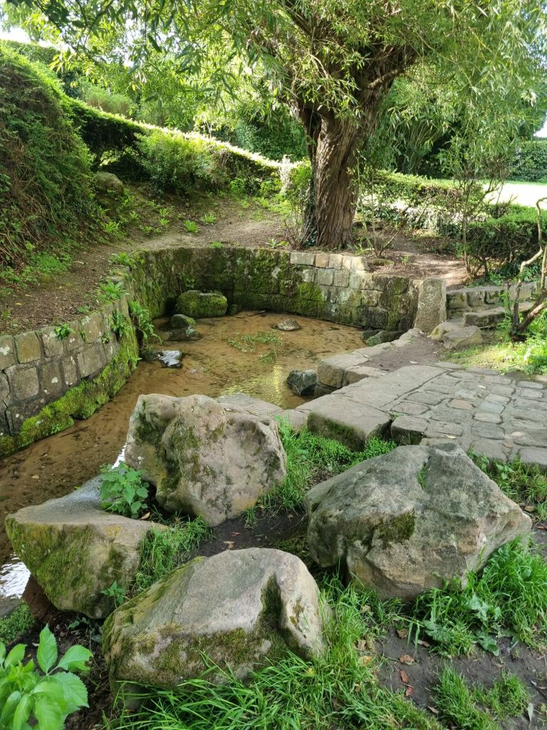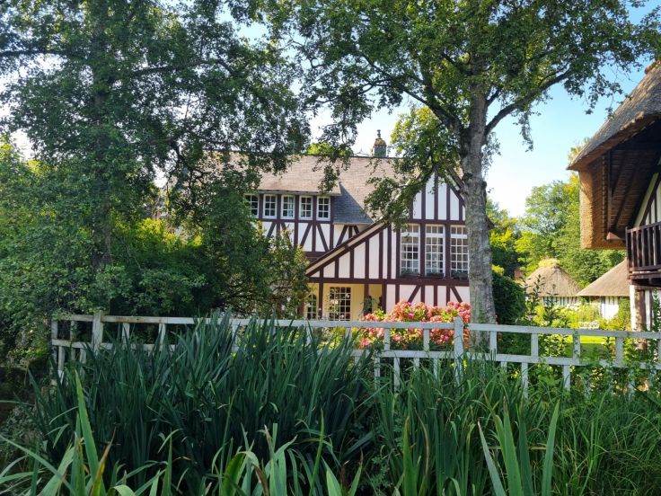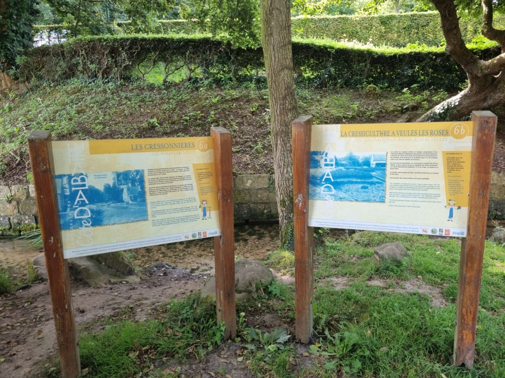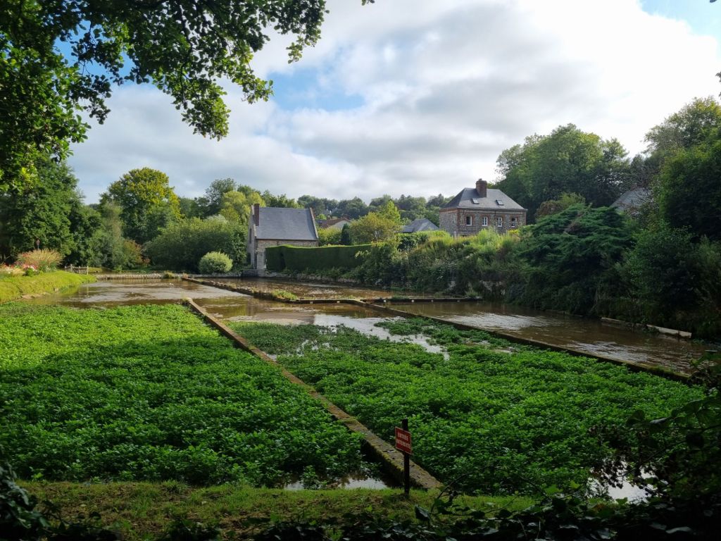 Nach dem Frühstück fahren wir die Alabasterküste entlang nach Veules-les-Roses, eines von sechs normannischen Örtchen mit der Auszeichnung „Schönstes Dorf Frankreichs“. Wir parken am Ortseingang („Parking des Cressonnières“, gratis, aber wenig Parkplätze, früh da sein lohnt sich!) und stoßen dort direkt auf eine der Besonderheit des idyllischen Dorfes: die Quelle des kürzesten Flüsschens Frankreichs! Die Veules mündet nach nur 1.149 Metern in den Atlantik. Rund um die Quelle ist eine weitere Besonderheit zu sehen: Hier wird in zahlreichen Becken Wasserkresse („Cressonières“) professionell angebaut.
