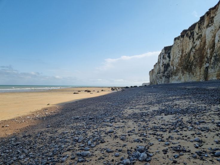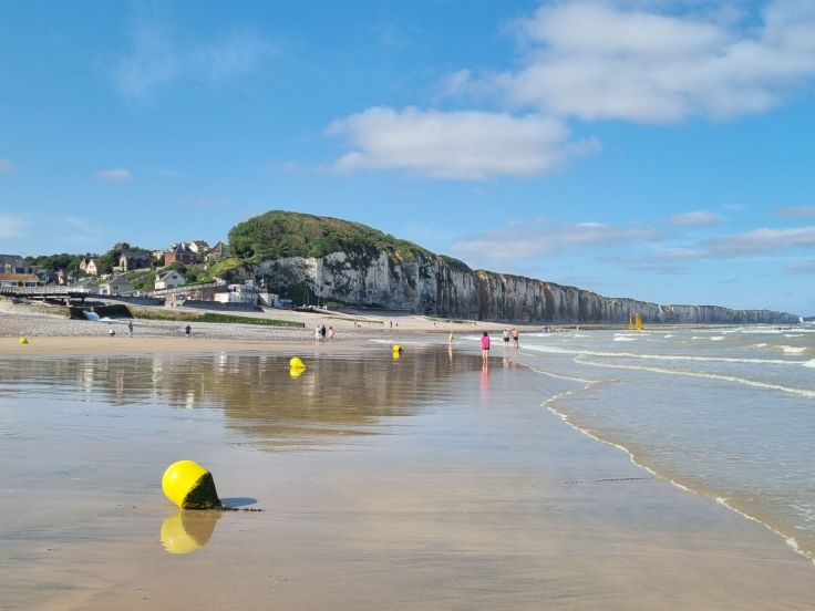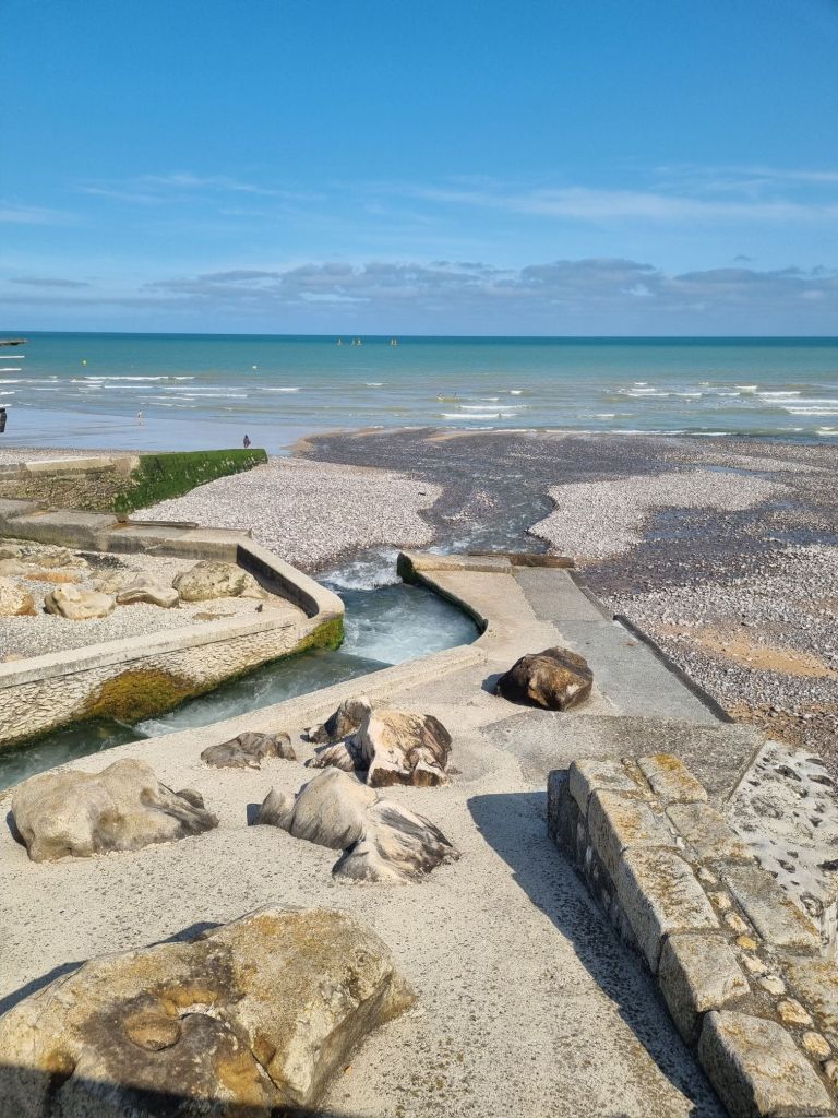 Wir laufen das Flüsschen entlang in Richtung Ortsmitte, vorbei an Mühlen und hübschen, teils reetgedeckten Häusern, das Örtchen ist wahrlich schön anzuschauen. Über die Hauptstraße mit Shops und Restaurants führt unser Weg bis ans Meer, wo die Veules in den Atlantik mündet. Eine breite Uferpromenade mit Sitzgelegenheiten, Umkleiden, Toiletten, Infotafeln, Spielgeräten und sogar ein kleines Kinderschwimmbad erwarten uns hier. Besonders schön ist nicht nur der Ausblick auf die Klippen rechts und links, sondern auch der feine Sandstrand, der zum Baden geradezu einlädt. Zumindest diejenigen, die sich von den frischen 19 Grad Wassertemperatur nicht abschrecken lassen. Ganz nah kommen wir hier auch an die Klippen und sehen die in Bändern eingelagerten Feuersteine im Kreidefelsen. In Étretat ist der Spaziergang unterhalb der Klippen offiziell verboten. Unser Fazit zu Veules-les-Roses: Das malerische Örtchen ist definitiv einen Besuch wert, nicht zuletzt wegen des schönen Sandstrands, der uns doch besser gefällt als die Kiesstrände andernorts an der Alabasterküste.