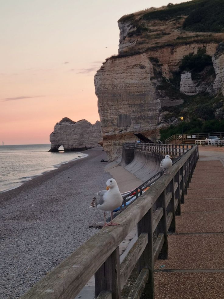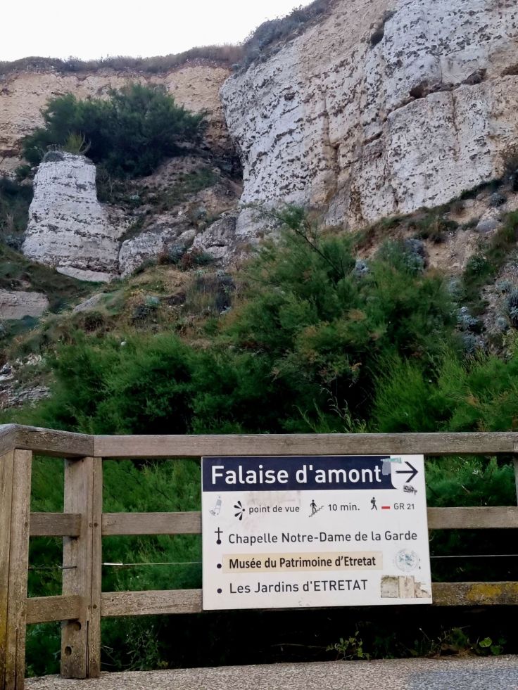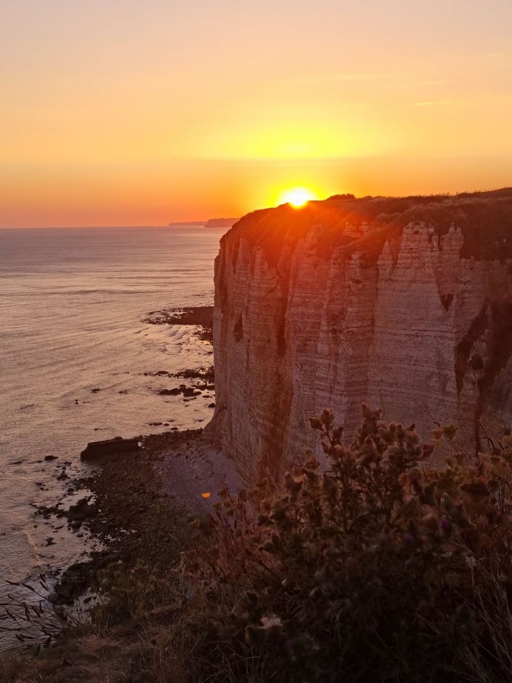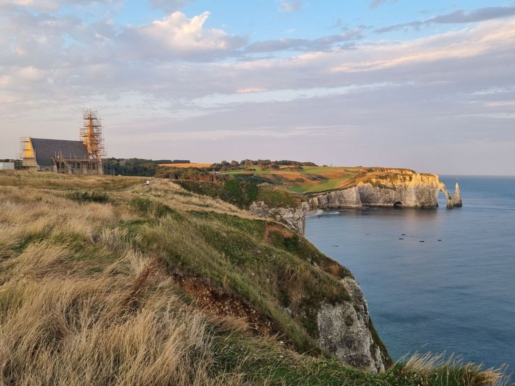 Auch wir flanieren über die nun fast menschenleere Promenade, die rechts und links von zwei berühmten Felsformation eingerahmt wird: der Falaise d’Amont und der noch bekannteren Falaise d’Aval. An der Falaise d’Amont steigen wir auf zur Kapelle Notre-Dame de la Garde und von dort bietet sich ein traumhafter Ausblick auf das Örtchen und die Kreidekliff-Formationen – erst recht zum Sonnenaufgang! Erneut können wir uns kaum sattsehen an dieser wunderschönen Szenerie.