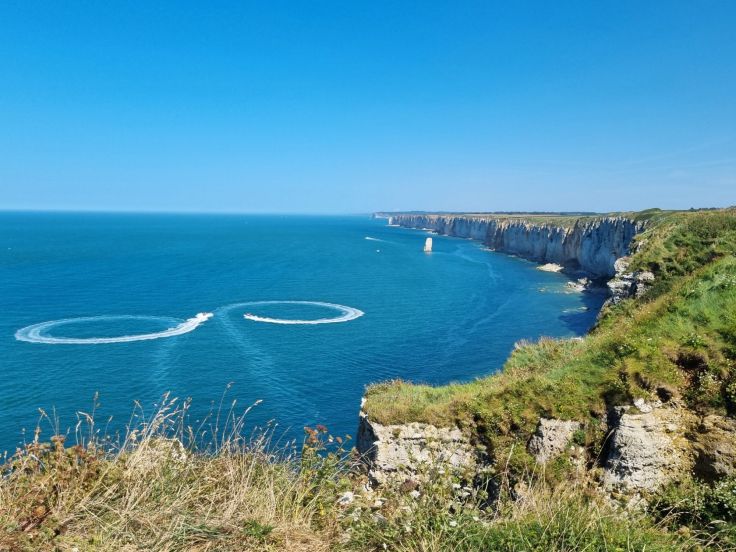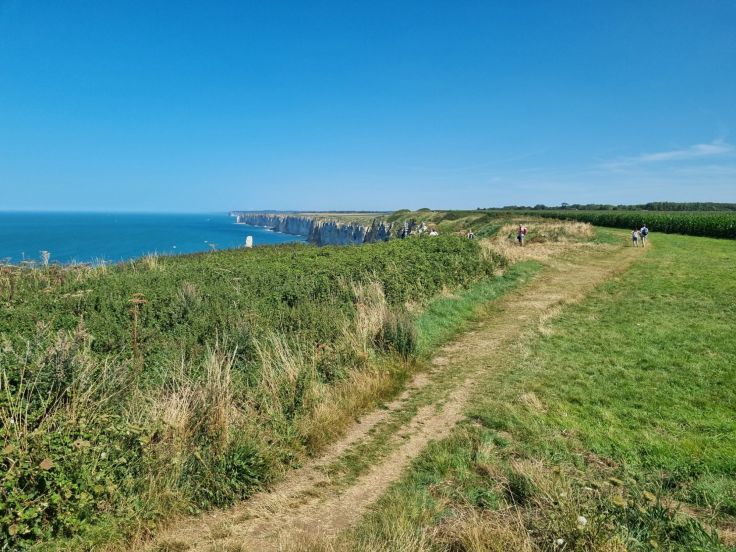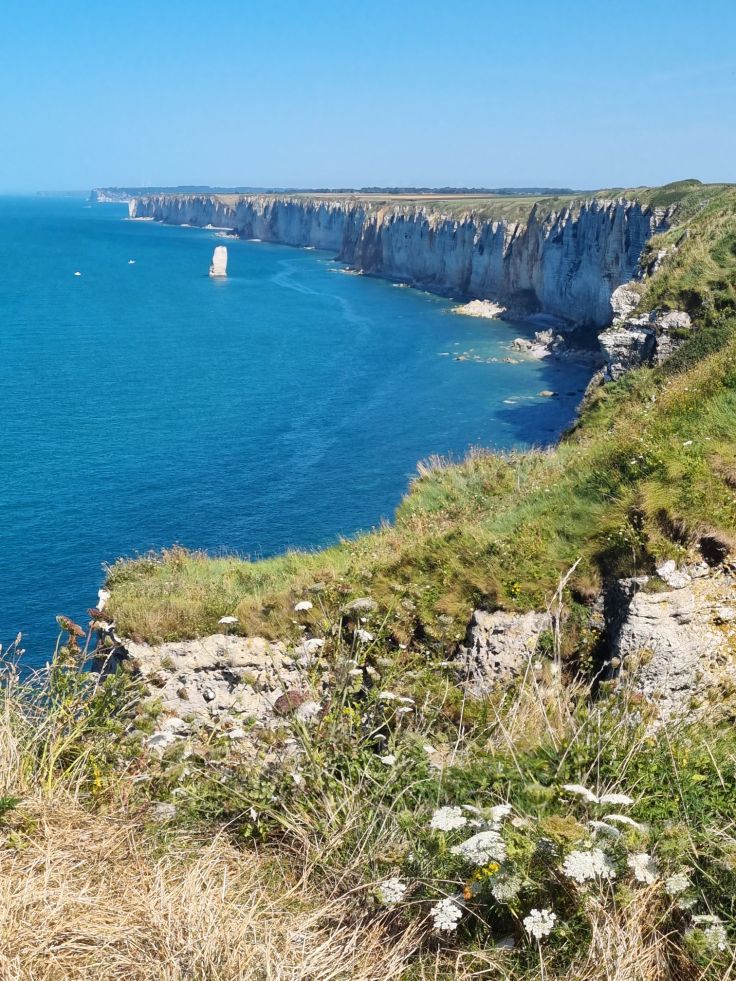 Unsere Unterkunft liegt (glücklicherweise) einige Kilometer landeinwärts von Étretat, in Les Loges (Relais Les Loges Étretat). Gleich als erstes wollen wir in das Städtchen fahren und stellen schnell fest: keine Chance. In der Hochsaison bewegt man sich in und um Étretat im Schritttempo, das ist uns zu blöd. Stattdessen fahren wir ein Stück die Küstenstraße (D11) in Richtung Fécamp und stellen unser Auto kurz vor Bénouville am Straßenrand ab und laufen auf einem kleinen Trampelpfad Richtung Meer. Und da ist sie schon, die Steilküste! Kerzengerade fällt sie ins tiefblaue Meer, aus dem sich direkt vor uns die Felsnadel Aiguille de Belval erhebt. Gegenüber können wir sogar die englische Küste sehen. Wir laufen auf dem Klippenweg (breit und gut machbar, allerdings „ungesichert“ – Achtung mit kleinen Kindern!) bis kurz vor Étretat – die Aussicht ist einfach herrlich.