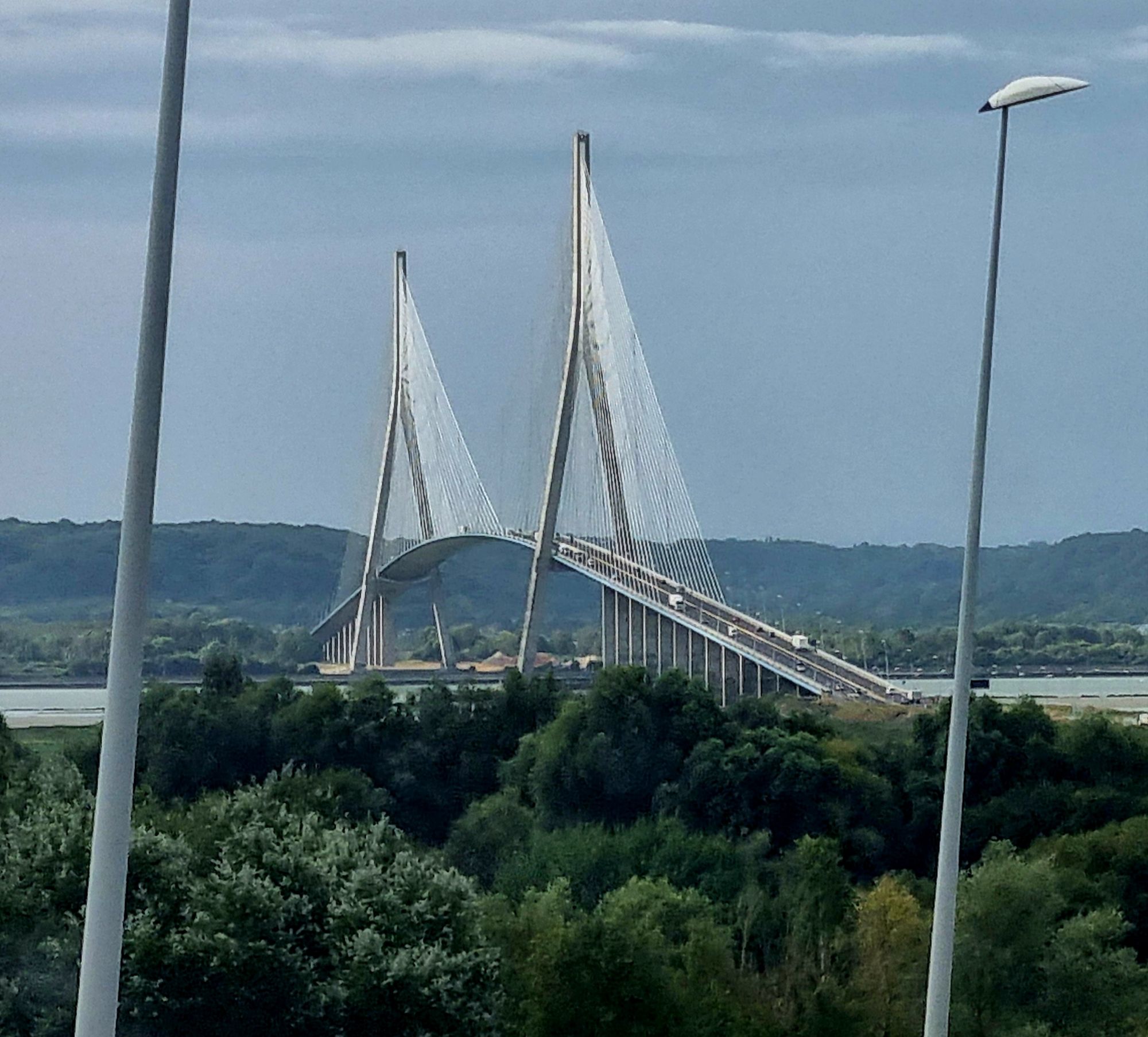 Das ist mal eine imposante Brücke: Um von der Alabasterküste westwärts zum nächsten normannischen Küstenabschnitt zu gelangen, müssen wir die Seine überqueren und das geschieht über die Pont de Normandie.