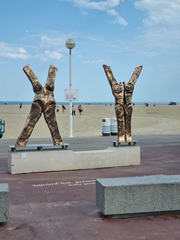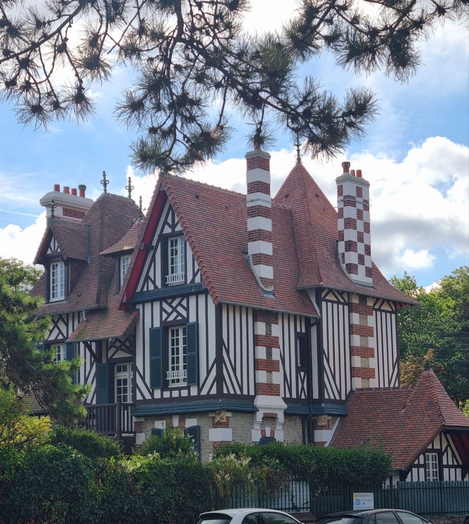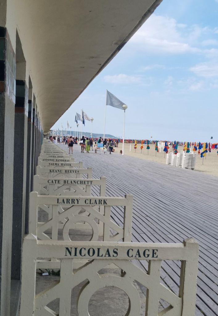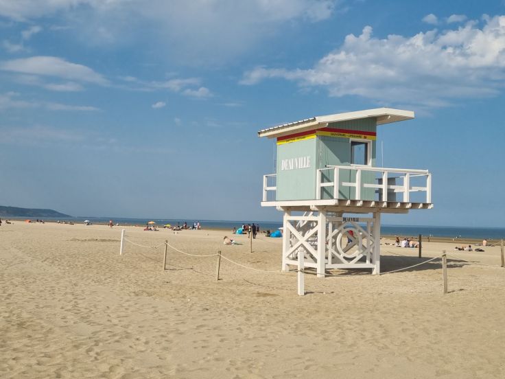 Weiter westwärts folgt die Diva der Blumenküste schlechthin: Deauville. Die Stadt ist der Inbegriff eines mondänen Villen-Seebads. Coco Chanel eröffnete hier ihre erste Boutique außerhalb von Paris und zeigte hier ihre Strandmode und beim amerikanischen Filmfestival kommen jährlich zahlreiche Stars und Sternchen in die Stadt. Von der Bedeutung als Stadt der Cineasten zeugt insbesondere die über 700 Meter lange „Promenade des Planches„. Die Badehäuschen an der Strandpromenade wurden bereits in den 1920er Jahren eingeweiht und seit 1975 tragen sie die Namen amerikanischer Schauspieler/-innen und Regisseure. Auch der breite, feinsandige Strand kann sich sehen lassen und lädt zum Baden ein. Überraschend für uns: ein Schirm und zwei Liegen kosten pro Tag 30 Euro (Stand 2024) – da haben wir in Italien schon andere Preise gesehen…