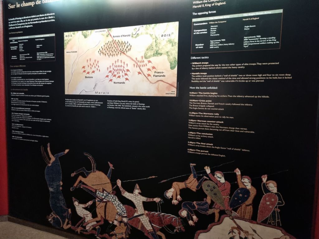 Unbedingt empfehlenswert ist der Besuch des Teppichs von Bayeux, ein UNESCO-Weltkulturerbe. Der fast 70 Meter lange Teppich erzählt bildhaft die Geschehnisse rund um die Eroberung Englands im Jahr 1066 durch den Herzog der Normandie, Wilhelm den Eroberer. Es ist quasi ein mittelalterliches Comic, detailreich und kunstfertig, das es den vielen damaligen Analphabeten ermöglichte, die Geschichte zu verstehen.