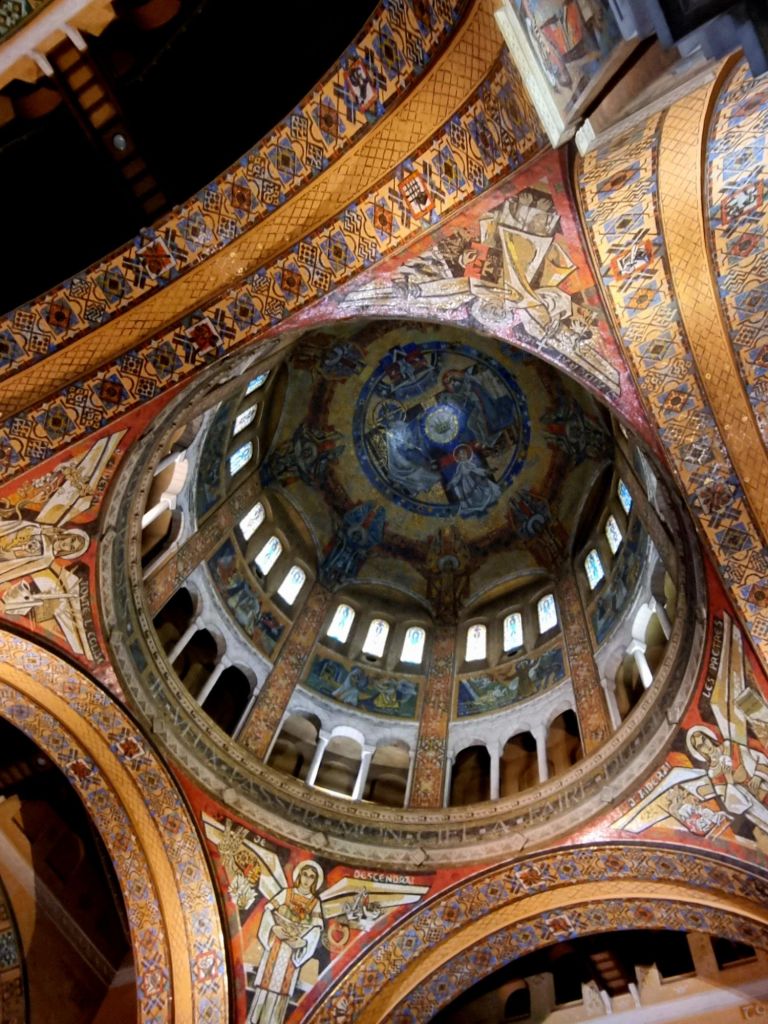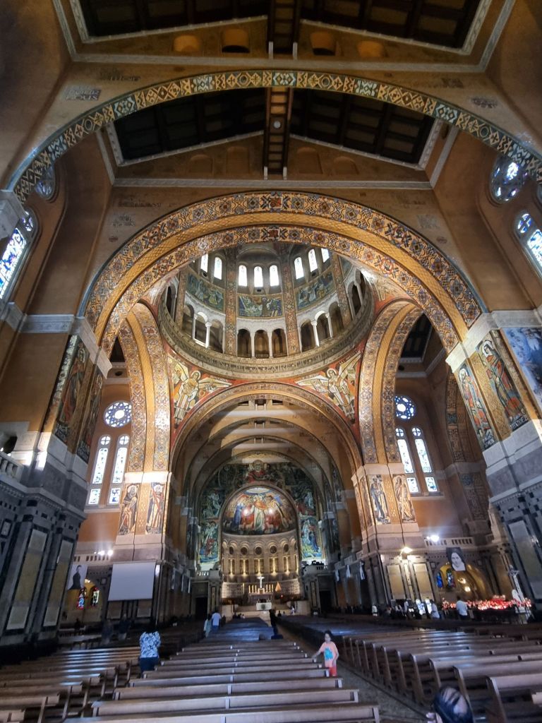 Das Glück von Bayeux, im 2. Weltkrieg nicht zerstört worden zu sein, hatte Lisieux nicht. Die Stadt selbst ist daher nicht sonderlich attraktiv, dass sie trotzdem viele Besucher anzieht, liegt an einer Heiligen. Lisieux ist nach Lourdes der zweitwichtigste französische Wallfahrtsort, hier hat die Heilige Thérèse vom Kinde Jesu im Karmeliter-Orden gelebt und gewirkt. Mit nur 24 Jahren verstarb sie 1897 und wurde 1925 heiliggesprochen, 1954 erfolgte die Einweihung der Basilika Sainte-Thérèse. Als Nicht-Katholikin sind Heilige nicht gerade mein „Spezialgebiet“, aber da uns in den zuvor besuchten Kirchenhäusern immer wieder Thérèse „begegnet“ war, wollte ich doch mehr darüber wissen, warum sie von so vielen verehrt wird. Die neobyzantinisch gestaltete Basilika ist in Teilen fast eine Art Museum, das zahlreiche Informationen über ihr Leben und ihre Familie liefert. An vielen Stellen stehen Zitate über die „Liebe“ und in Thérèses Schriften ist der Satz zu finden: „Meine Berufung ist die Liebe.“ Sie glaubte, dass sich die Hingabe an Gott und die Mitmenschen gerade in den kleinen liebevollen Gesten des Alltags äußert (ihr sogenannter „kleiner Weg“ der Liebe). Damit stand sie nicht nur im Gegensatz zum sonst sehr strengen Gottesbild ihrer Zeit, sondern spricht mit dieser für alle verständlichen und für „normale Gläubige“ umsetzbaren Botschaft viele Menschen an – auch uns! Unsere jüngere Tochter kauft sich ein Armband mit Bildern von Thérèse, ich selbst mir ihr autobiographisches Buch „Geschichten einer Seele“ – allerdings erst nach dem Urlaub, denn der umfangreiche Kirchenshop enthält keinerlei (!!!) Bücher in einer anderen Sprache als französisch – ein Unding, bei tausenden anderssprachigen Besuchern!