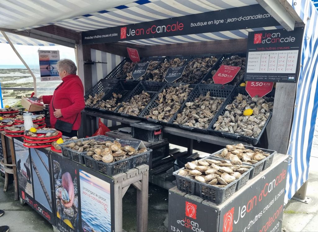 Bei so viel Superlativen sind wir schon sehr gespannt und stellen, in Erwartung von Touristenmassen, unser Auto sicherheitshalber schon am Ortseingang (Parkplatz Rue Ernest Lamort) ab. Glücklicherweise ist es hier nicht ganz so schlimm und wir laufen gemütlich die Uferpromenade (Quai John Kennedy – vielleicht aß der auch gerne Austern?) entlang. Wir passieren zahlreiche Restaurants, die meisten präsentieren ihre Ware, insbesondere Austern, vor der Tür. Aber unser Ziel ist der Leuchtturm, denn hier befindet sich der Austernmarkt (Marché aux Huîtres), wo die Produzenten täglich und ganzjährig fangfrische Austern verkauften. Was für ein Schlaraffenland für Austernliebhaber! Frischer geht es nicht und auch nicht günstiger, je nach Qualität und Größe kosten die Austern hier ab 50 Cent (zum Vergleich: in der Frankfurter Gastronomie sind sie für fünf Euro aufwärts zu haben). Die Austern werden direkt vor den Augen der Kunden geöffnet, mit einer Zitrone serviert und anschließend auf den Treppenstufen vor dem Strand sitzend verspeist. Wer fertig ist, wirft die Schalen einfach auf den Strand (die Zitrone eigentlich nicht, aber auch diese landen immer wieder im Austernberg). Wir probieren natürlich insbesondere die hiesige flache Auster, Belon de Cancale genannt, die uns mit ihrem festen Fleisch und leicht nussigem Geschmack bestens mundet. Sie gilt als die Gourmet-Auster schlechthin, bei uns daheim bekommen wir in erster Linie die weit häufigeren „bauchigen“ Felsenaustern.