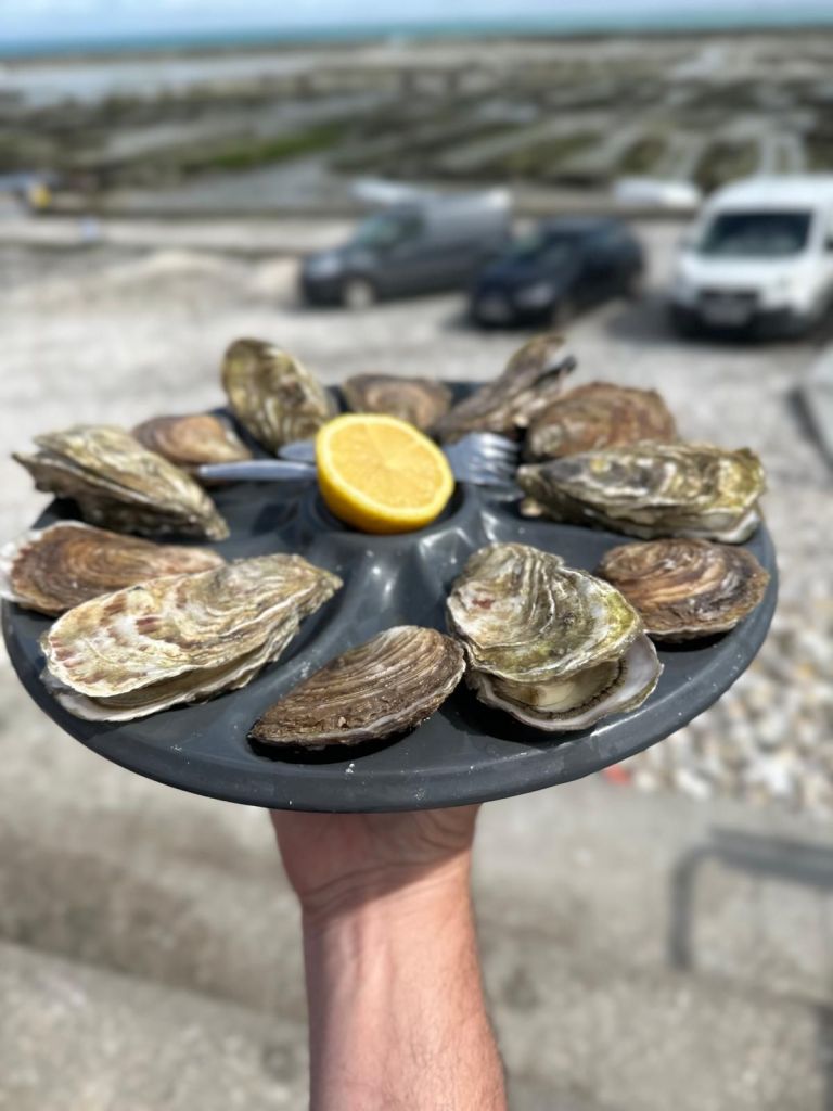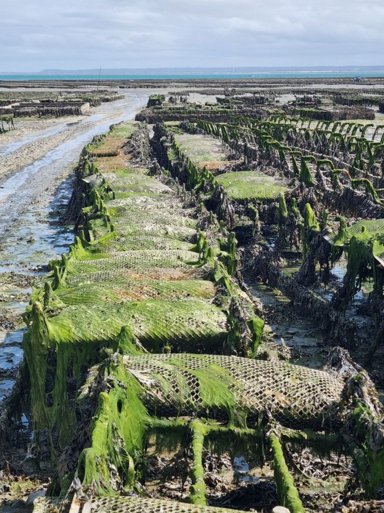 Während wir unsere Austern schlürfen, blicken wir über die Bucht, in der Ferne der Mont-St.-Michel. Es herrscht Ebbe, der Atlantik hat sich weit zurückgezogen und Holzgestelle freigelegt, in denen grob gewebte Säcke hängen, dazwischen stehen Traktoren zur Arbeit bereit. Laut Internet werden in Cancale jährlich fünftausend Tonnen huîtres creuses (Felsenaustern) und eintausend Tonnen huîtres plats (Flachaustern), ein Viertel der Gesamtproduktion Frankreichs, geerntet. Wer mehr darüber wissen will: Auch Führungen lassen sich hier buchen, das werden wir das nächste Mal sicher machen. Unser Fazit: Auch wenn ihr keine Austern mögt, lohnt sich ein Besuch. Und für Austernliebhaber ist das hier das Paradies!