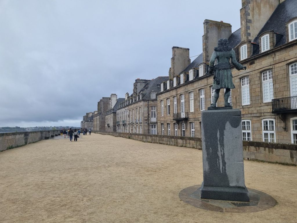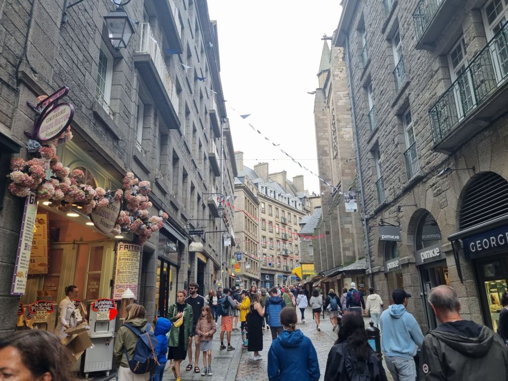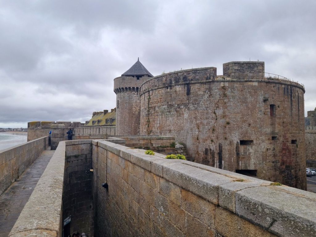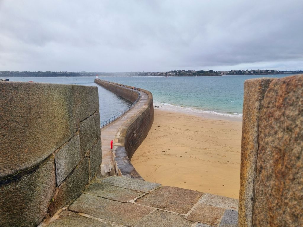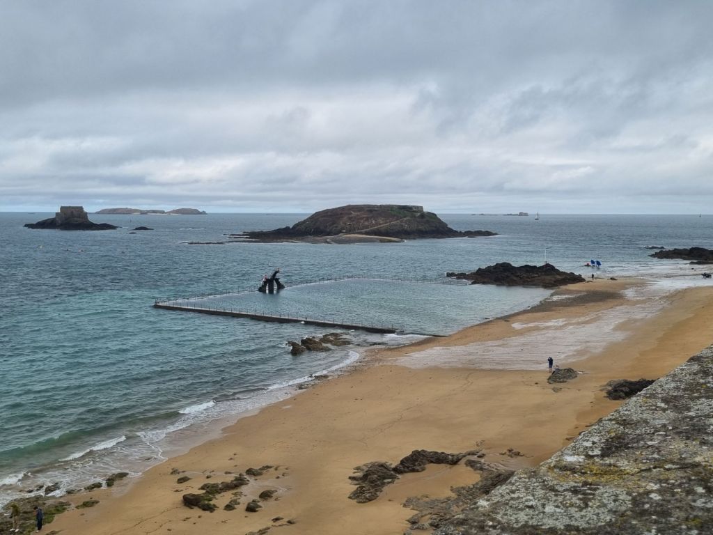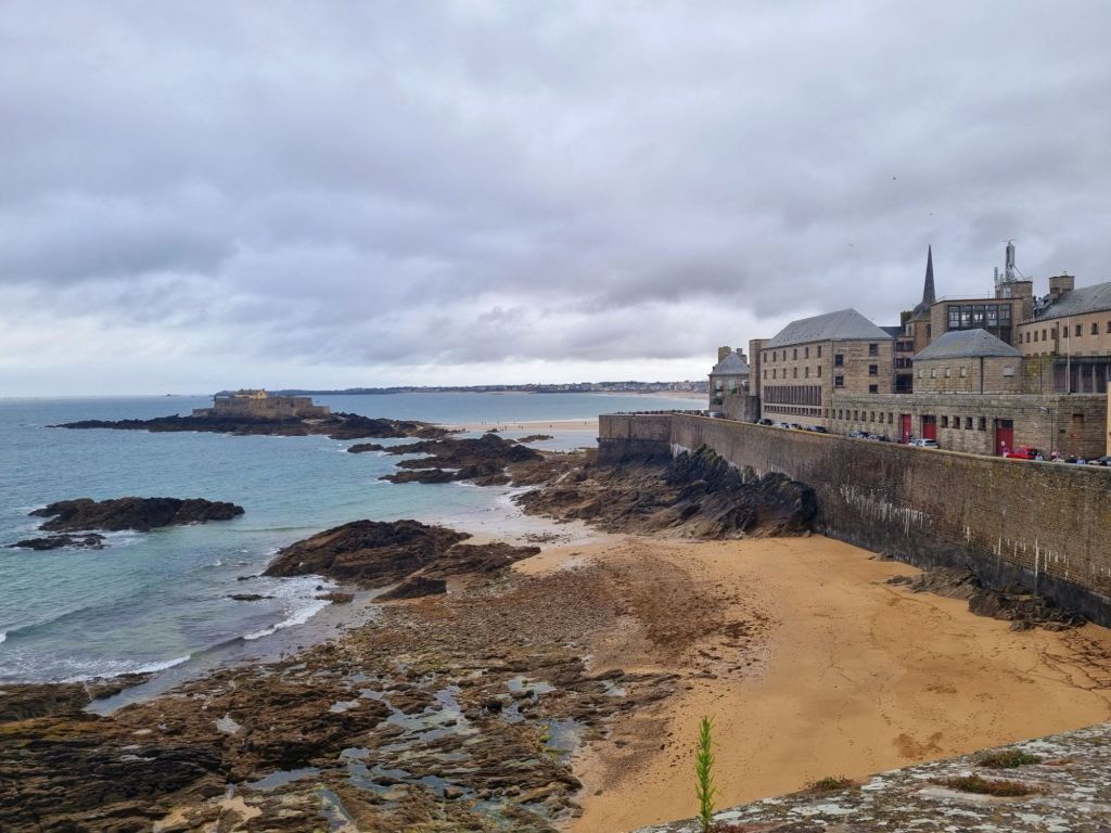 Heute ist es etwas regnerisch, aber wie alle Besucher laufen auch wir den etwa zwei Kilometer langen Rundweg auf der Stadtmauer („Les Remparts“). Auf der einen Seite liegt die Altstadt mit ihren Gassen – teils eng und verwinkelt, teils ruhige Wohnstraßen und teils geschäftige Fußgängerzonen, aber immer gibt es etwas zu sehen. Einmal umdrehen und schon liegt uns der Ozean mit seinem Inseln und Booten zu Füßen, der Hafen, der Strand und ein Naturschwimmbad, gegenüber die Stadt Dinan, sehr hübsch, das alles. Wir spazieren bis zur Bastion de la Reine, von wo aus wir einen schönen Blick auf den weitläufigen Stadtstrand Grand Plage du Sillon haben. Gleich daneben befindet sich das Chateau de la Duchesse Anne, das heute das schmucke Rathaus der Stadt beherbergt. Von hier aus tauchen wir ein in das Altstadtgetümmel, Shoppen und Schlemmen werden hier groß geschrieben. Vor allem Süßigkeiten- und Schokoladeliebhaber kommen hier voll auf ihre Kosten. Etwas ganz Alltäglich-Unalltägliches bietet das Maison Bordier: nämlich Butter (sowie Käse und andere Milchprodukte). Aber nicht irgendeine, sondern Butter mit Algen, Yuzu, geräuchertem Salz und noch viel mehr! Und wenn ihr noch einen Restauranttipp wollt: Wir haben uns im L’Absinthe sehr wohl gefühlt, das Preis-Leistungsverhältnis des Mittagsmenüs ist sehr gut.