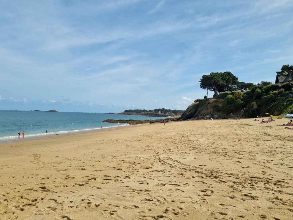 Die Nachbarstadt Dinard lässt sich von Saint-Malo aus entweder direkt mit der Fähre oder über einem kleinen Umweg mit dem Auto erreichen – der Fluss Rance zwischen diesen beiden Städten ist an seiner Mündung sehr breit. Dinard ist das größte der Villen-Seebäder an der Smaragdküste. Strände und imposante Villen aus der Belle Époque-Zeit haben sie alle, aber Dinard kann mit einem Casino, Kunstgalerien und dem britischen Filmfestival auftrumpfen. Als Urlaubsort gefallen uns die benachbarten Saint-Lunaire und Saint-Briac-sur-Mer besser, hier geht es ruhiger zu und mit weniger „Schicki-Micki“. Auch zwischen diesen Städten finden wir immer wieder wunderschöne, trotz bestem Wetter fast menschenleere Strände, wie die Plage de la Vosse aux Vaults – trotz Hochsaison finden wir hier in der Wohnstraße problemlos einen Parkplatz. Wer noch mehr Strand und Infrastruktur sucht, ist an der Plage de Longchamp gut aufgehoben, der Strand wird von einem alten Bunker „bewacht“.