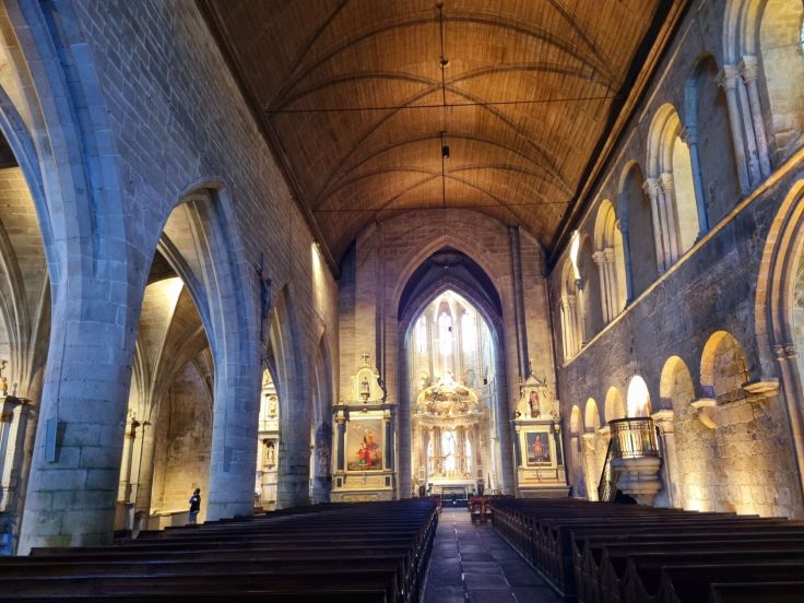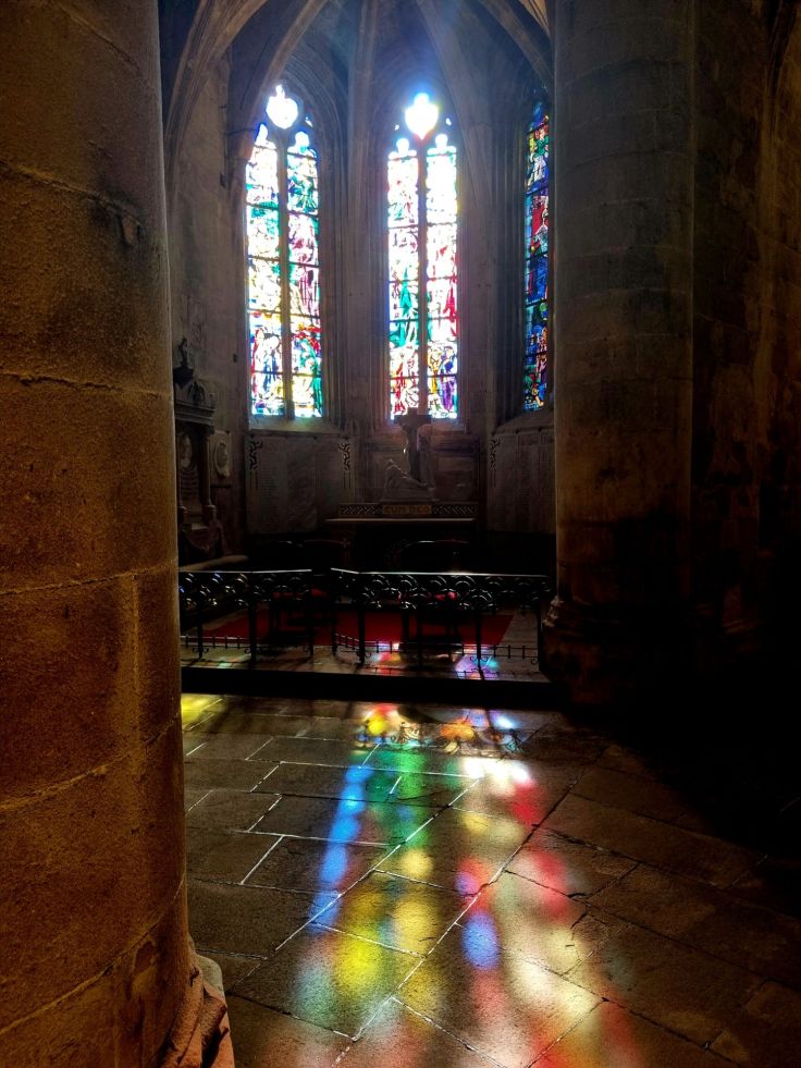 Etwas besonderes ist auch die unvollendete Basilika Saint-Saveur. Seit dem 12. Jahrhundert wird an ihr gebaut, weshalb sich romanische, gotische, barocke und klassizistische Elemente an und in ihr finden. In der Basilika ist das Herz des Ritters Bertrand Du Guesclin begraben, der die Stadt im Hundertjährigen Krieg erfolgreich gegen die Engländer verteidigt hat. Uns ziehen die vielfarbigen Lichtspiele der Sonne durch die bunten Glasfenster in ihren Bann.