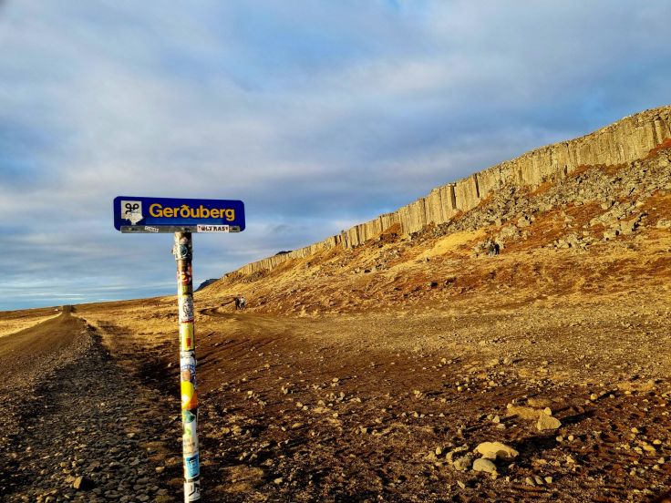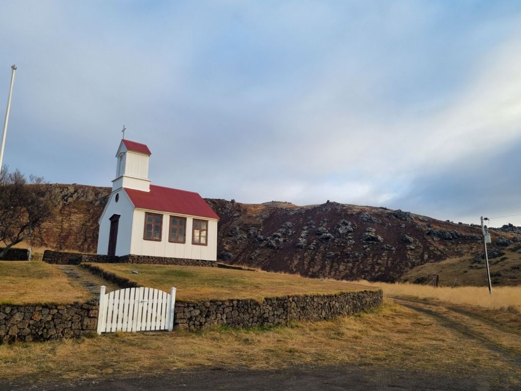 Am nächsten Morgen geht es los zur Snaefellsnes-Halbinsel. Die Sonne geht Mitte Oktober auf Island um ca. 8:30 Uhr auf und um 18 Uhr unter. Aber die ersten und letzten Stunden haben doch eher Dämmerungscharakter, da passt es gut, dass wir bis zum ersten Stopp eine Zeitlang unterwegs sind. Denn an den Basaltklippen von Gerduberg empfangen uns die Sonnenstrahlen der aufgehenden Sonne dann in vollster Pracht! Die Basaltklippen sind schon von der Straße aus (Nr. 54) zu sehen, ein kurzer Schotterweg führt dorthin, kostenlose Parkplätze sind ausreichend vorhanden. Wir fahren noch ein Stück bis zum Kirchlein Raudamelskirkja weiter, das sich an die Felswand schmiegt. Immer wieder finden wir auf Island diese „Kleinstkirchen“ und fragen uns, wie oft und mit wieviel Personen in dieser Einsamkeit wohl die Gottesdienste stattfinden?