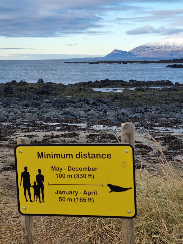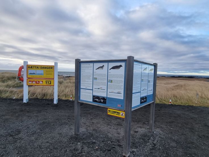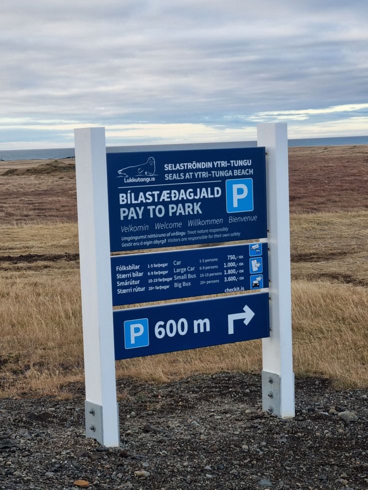 Unser nächster Stopp ist einer der bekanntesten Haltepunkte auf der Halbinsel: der Robbenstrand Ytri Tunga, ebenfalls unweit der Straße Nr. 54. Entsprechend seiner „Prominenz“ ist hier ein Parkentgelt zu entrichten (wie üblich mithilfe des Nummernschilds – das per Kamera erfasst wird – und der Kreditkarte). Für unser Geld bekommen wir nicht nur den Parkplatz, sondern auch Infotafeln zu den diversen Robbenarten, die dem Strandabschnitt ihren Namen gaben. Zahlreiche Warnschilder bitten darum, sich den Tieren nur bis zu einer gewissen Entfernung zu nähern. Nach einem kurzen Fußmarsch Richtung Meer sehen wir dann auch die Protagonisten, die sich auf den Felsen räkeln. Besonders malerisch wirkt die Szenerie durch den Gletscher Snaefellsjökull im Hintergrund!