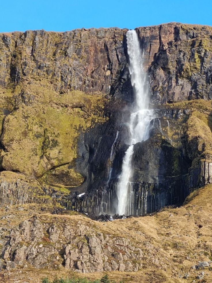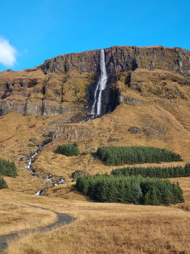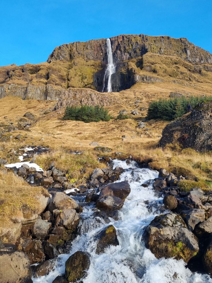 Wieder nur wenige Kilometer weiter halten wir an einem der vielen Wasserfälle, dem Bjarnarfoss (kostenloser Parkplatz, ebenfalls fast direkt an der Nr. 54). Über einen befestigten Spazierweg geht es nach oben bis zu einer Brücke. Gerade in den Morgenstunden, wenn die Sonne vom Meer her strahlt, bietet der sich über mehrere Kaskaden aus Basaltsäulen ergießende Wasserfall einen schönen Anblick. Bis zur Brücke ist dies ein schöner kurzer Spaziergang, wer höher will, muss klettern und sei im Winterhalbjahr vor vereisten Felsen gewarnt!