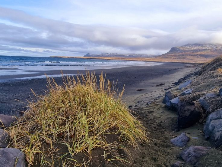 Aufgrund des begrenzten Tageslichts machen wir nicht die große Runde um den Snaefellsjökull herum, sondern fahren die Nr. 54 weiter über den Pass Richtung Olafsvik. Auf der Passhöhe genießen wir den schönen Ausblick auf die nördliche Küste mit ihren hellen und schwarzen Stränden.