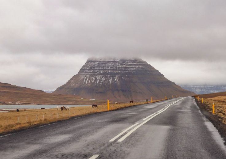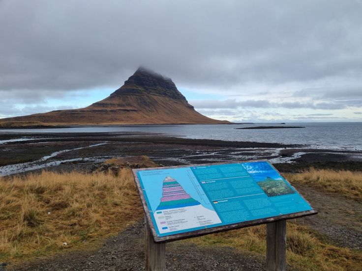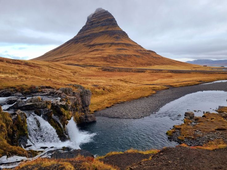 Leider zieht das Wetter auf der Nordseite zu und so ist unser erster Anblick der berühmtesten Sehenswürdigkeit der Halbinsel etwas wolkenverhangen. Die Rede ist vom Kirkjufell, dem „Kirchenfelsen“, auch Zipfelmützenberg genannt. Der links und rechts vorbeischrammende Gletscher hat den markanten Berg geformt, der unter anderem als Kulisse bei „Games of Thrones“ diente. Er ist aber auch wirklich eindrucksvoll und kaum einer lässt sich, trotz erneuter Parkplatz-Gebührenpflicht, seinen Anblick mit den Wasserfällen im Vordergrund entgehen. Aber auch aus anderen Perspektiven (andere Parkplätze sind kostenfrei) ist der Felsen imposant.