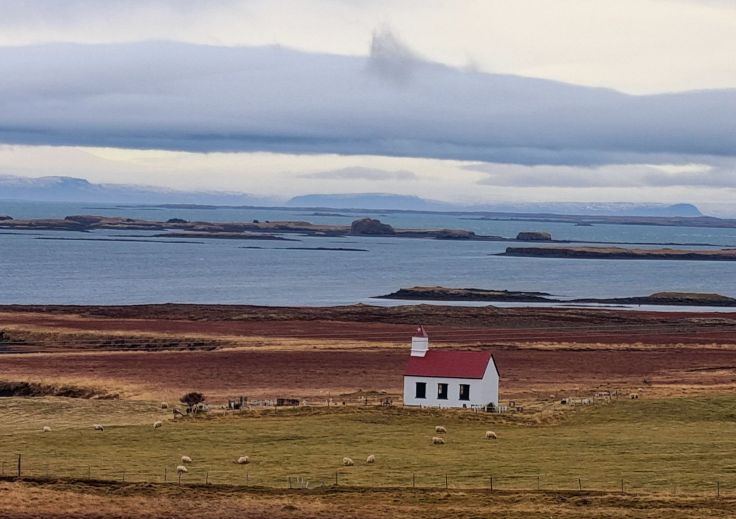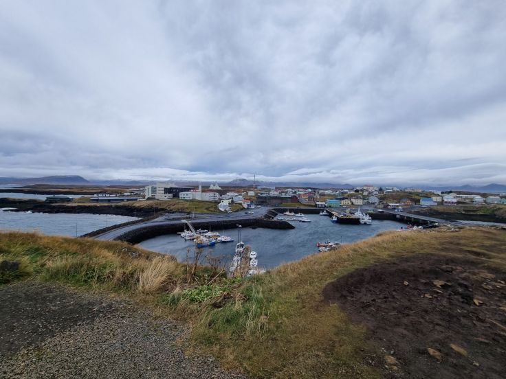 Wir setzen die Fahrt fort in die nächste Kleinstadt, Stykkisholmur, Fährhafen zu den einsamen Westfjorden. Wie ein Vorgeschmack auf diese noch abgeschiedenere Gegend mutet der starke Wind an, der uns fast die Autotüre wegreißt. Trotzdem parken wir das Auto am Hafen und steigen über eine Treppe auf den Felsen Sugandisey, wo wir fast weggeblasen werden. Lohn der Mühen ist der Ausblick über den Hafen und die Schären vom markanten roten Leuchtturm aus. Dass neben dem Tourismus die Haupteinnahmequelle des Städtchens die Fischerei ist, lässt sich an den zahlreichen Schiffen unschwer erkennen.