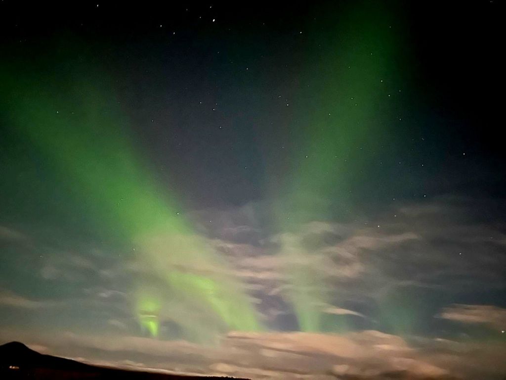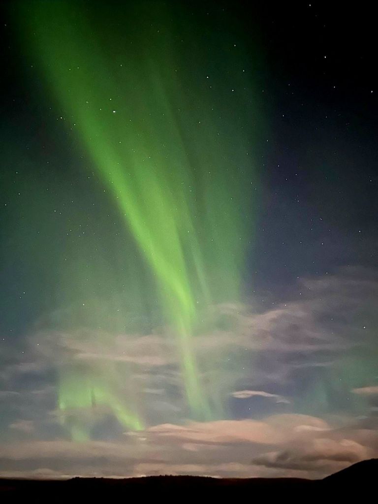 Sollte dies ein Vorbote auf ein weiteres Naturphänomen sein? Die Rede ist von Polar- oder Nordlichtern (Aurora Borealis), die sich schwerpunktmäßig von Oktober bis April in den nördlichen Breiten zeigen. Schon seit unserer Ankunft habe ich täglich mithilfe des Aurora-Forecasts vom Icelandic Met Office die Voraussetzungen überprüft, nämlich die (möglichst geringe) Wolkenbedeckung (auf der Karte weiß) und die grundsätzliche Wahrscheinlichkeit für Nordlichter (vereinfacht gesagt aufgrund von Sonnenaktivität), zu sehen auf einer Skala rechts von 0 (gering) bis 9 (hoch). Heute zeigt das System wenig Wolken und einen Forecast-Wert von nicht besonders tollen „3“ – aber wenn überhaupt, dann würden wir diese Nacht Polarlichter sehen. Und tatsächlich werden beim Abendessen auf einmal alle hektisch: Polarlichter gesichtet! Die Kellner sagen uns nachher lachend, dass sie das gewohnt sind: Fluchtartig verlassen alle den Speisesaal. Mit bloßem Auge sehen wir zunächst wenig, aber durch die (Smartphone-)Kameras sind die grünen, tanzenden Lichter sofort gut zu erkennen. Bald werden sie stärker und wir sehen sie auch mit bloßem Auge. Welch tolles Erlebnis!