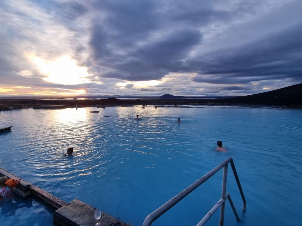Wir beziehen eilig unsere Zimmer im Fosshotel mit Blick über den See, denn es steht noch ein Besuch im Thermalbad auf dem Programm. Das Bad heißt für mich etwas irritierend „Myvatn Nature Bath„. Von wegen natürlich: die Badelagune an sich ist menschengemacht und das Wasser stammt aus Borlöchern. Es ist jedoch natürlicherweise reich an Mineralien, insbesondere an Kieselsäure, was ihm ein bläuliches Aussehen verleiht. Im Gegensatz zur ähnlich aussehenden Blauen Lagune bei Keflavik (siehe Geopark-Tour auf der Reykjanes Halbinsel) ist das Thermalbad von Myvatn deutlich weniger überlaufen. Das Bad hat zwei große (Schwimm-)Becken, eines wärmer (und mit Bar direkt im Wasser), das andere etwas kälter, einen noch heißeren großen Hot Tub sowie ein Dampfbad. Ach, ist das herrlich, hier zu schwimmen oder zu entspannen, mit einem Drink in der Hand! Bewusst sind wir in den Abendstunden hier und das hat sich gelohnt: Im 36 bis 40 Grad warmen Wasser treibend, genießen wir einen etwa 30-minütigen Sonnenuntergang, den wir so lang und so schön noch nie gesehen haben!