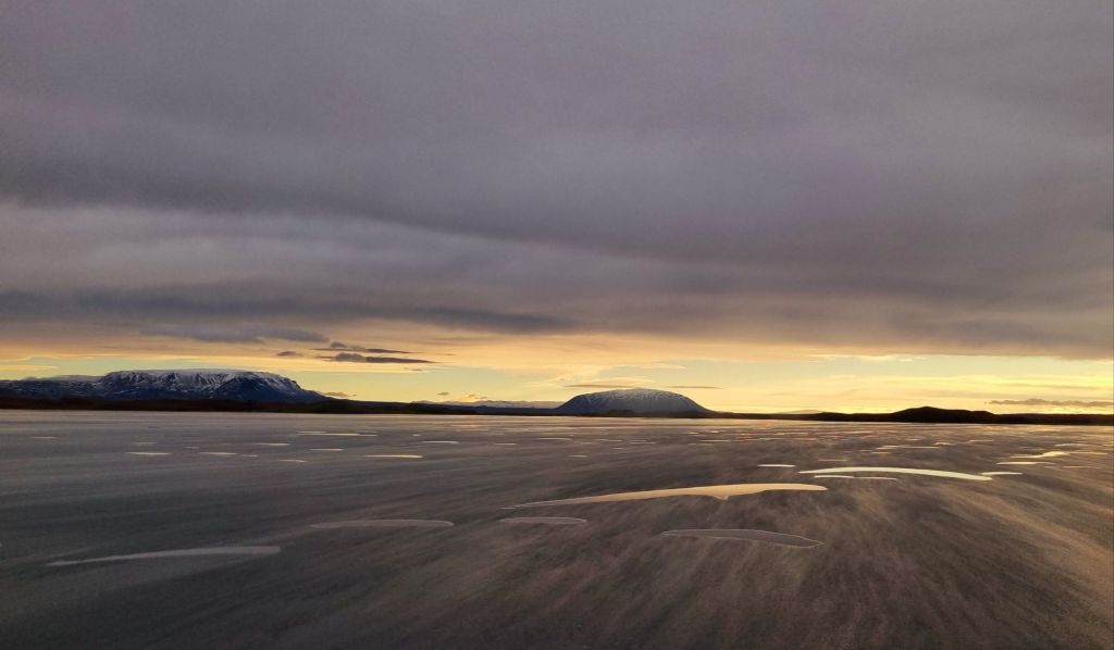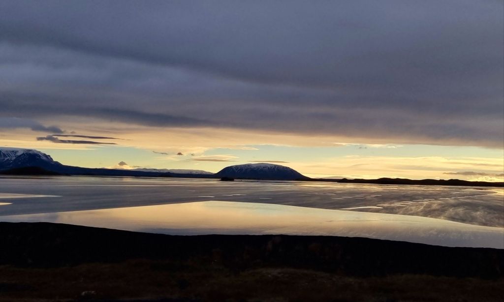 Um es vorweg zu nehmen: Unsere 24 Stunden rund um die Seenregion Myvatn sollten die schönsten und spektakulärsten werden, die wir jemals auf Island verbracht haben, mit fast allem, was diese Insel ausmacht! Sie beginnen am späten Nachmittag des Vortags, als wir uns dem See von Akureyri und dem Godafoss kommend nähern (siehe: Herzliche Hauptstadt des Nordens: Akureyri). Das sagenhaft schöne Dämmerungslicht zieht uns in seinen Bann, es lässt den teilweise gefrorenen See fast schon mystisch aussehen.