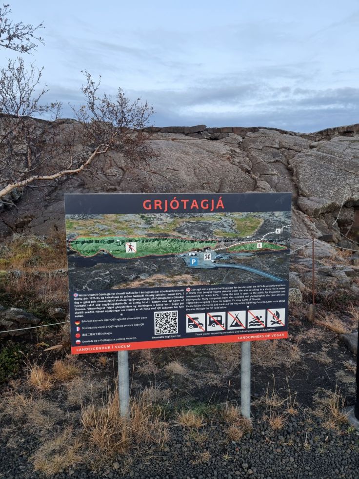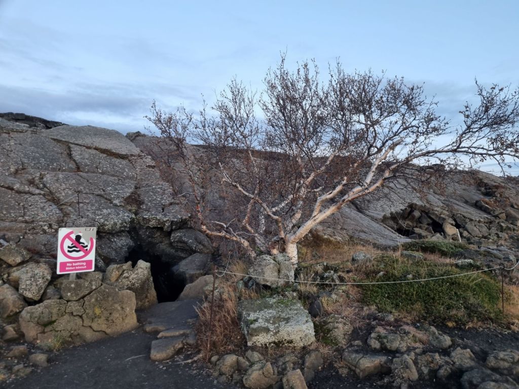 Erste Station ist die Grjotagja, eine heiße Quelle inmitten einer Lava-Höhle. Über zwei enge Öffnungen kann man zur Quelle hinuntersteigen, gutes Schuhwerk ist unbedingt erforderlich. Besucht diese Quelle am besten in den Randzeiten (z.B. wie wir frühmorgens), sonst könnt ihr lange anstehen, bis ihr hinunterklettern könnt. Falls euch diese Höhle bekannt vorkommt, sie bildet die Kulisse von Jon Snow und Ygrittes Liebesspiel in der Serie „Game of Thrones“. Baden ist dort nicht zuletzt wegen der schwankenden und mitunter zu heißen Wassertemperatur verboten. Klettert im Anschluss noch auf den Lavadom hinauf (Weg rechts), dann seht ihr die Erdspalte zwischen der eurasischen und nordamerikanischen Platte.