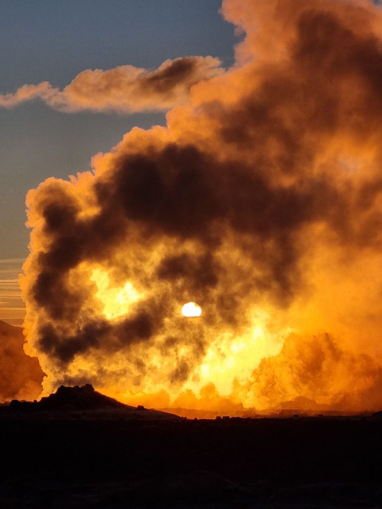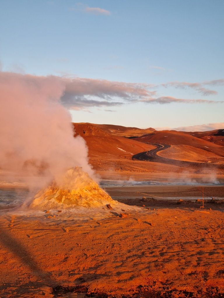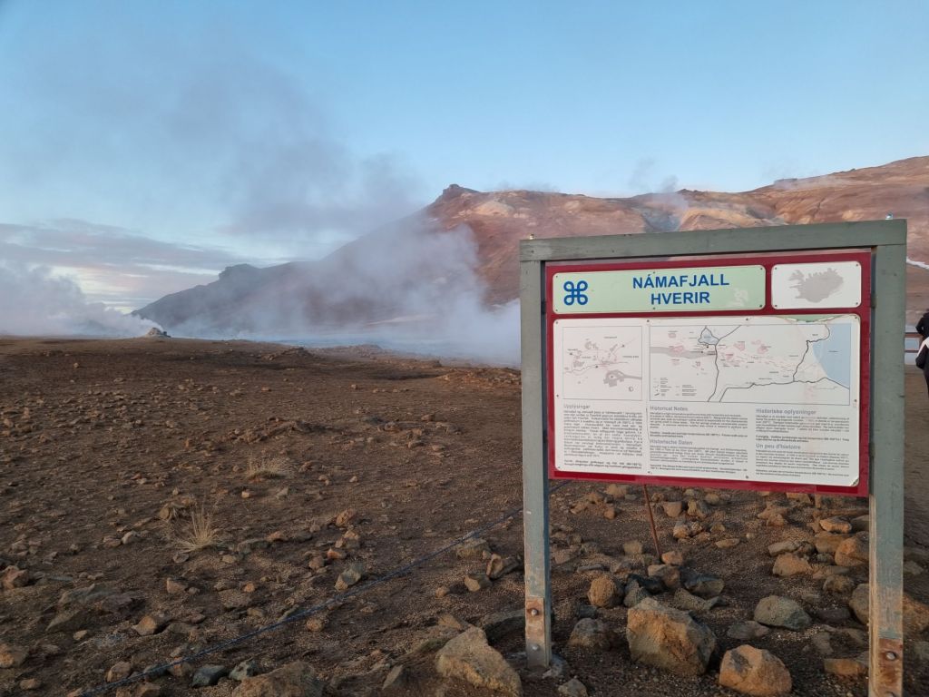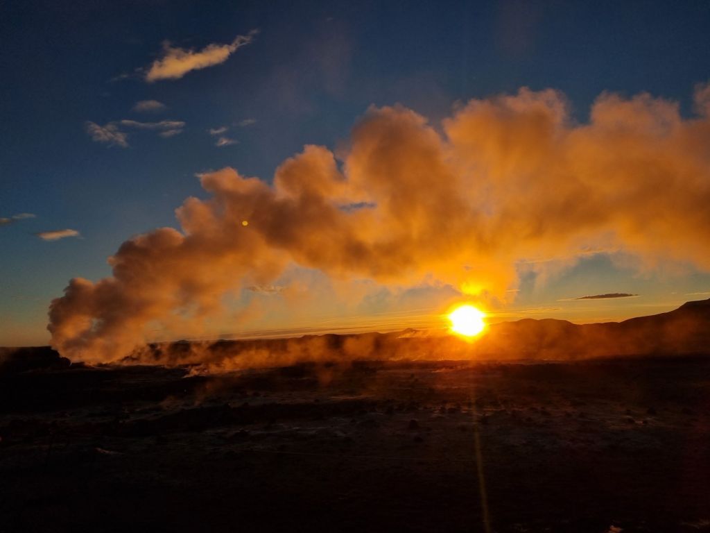 Mittlerweile geht langsam die Sonne auf, gerade als wir auf dem Parkplatz des Hverir-Geothermalfelds (kostenpflichtig) direkt an der Ringstraße eintreffen. Schon auf dem Parkplatz sind die Schwefelausdünstungen deutlich zu riechen, aber viel interessanter ist die sich bietende Szenerie, die kaum schöner sein könnte: Durch die zahlreichen qualmenden Fumarolen vor der aufgehenden Sonne sieht es aus, als ob der ganze Planet brennt. Auch lustige Rauch-Schatten-Bilder lassen sich hier machen. Beim letzten Foto habe ich etwas mit dem Farb-Filter gespielt, aber die Fotos zeigen durchaus die verschiedenen Schattierungen der hier auftretenden Mineralien, allen voran Schwefelverbindungen.