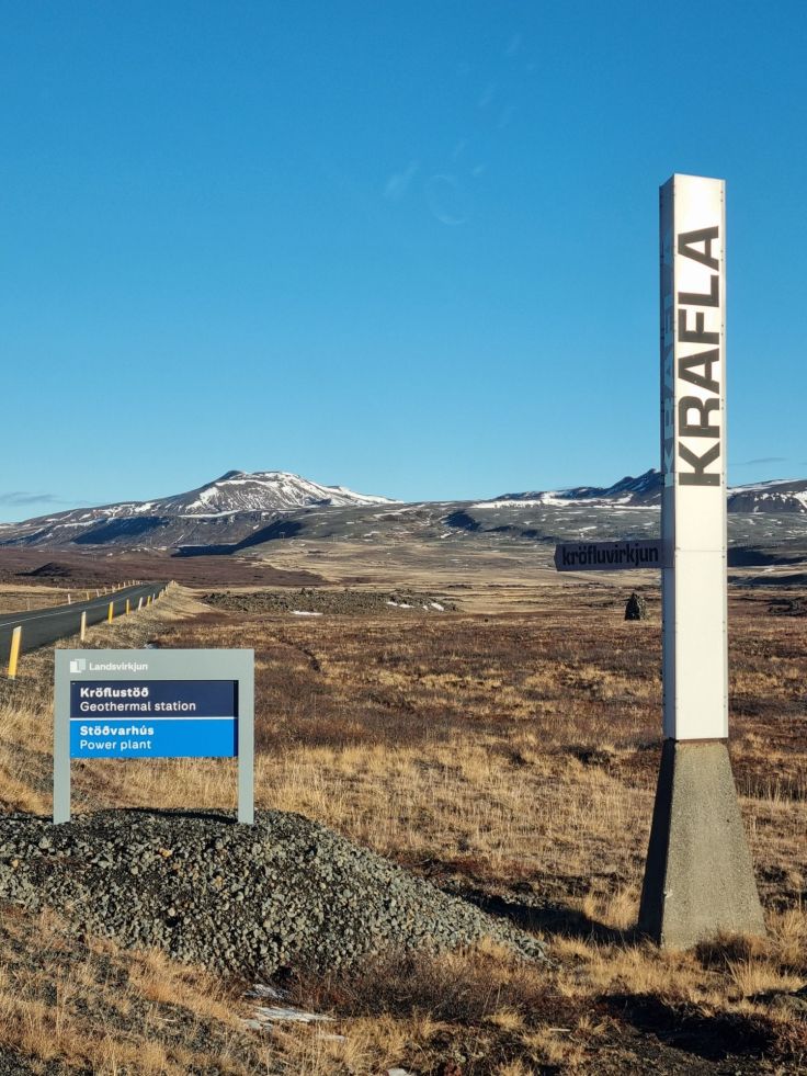 Folgt man der Straße weiter, gelangt man zunächst zum Krafla Kraftwerk, bevor eine Straße steil nach oben führt. Oben hat man auf einem Parkplatz eine gute Aussicht ins Tal und auf das Kraftwerk. Noch weiter oben folgt rechter Hand ein weiterer Parkplatz, von dem aus man nach ein paar Schritten den tiefblauen Krafla-Kratersee erreicht.