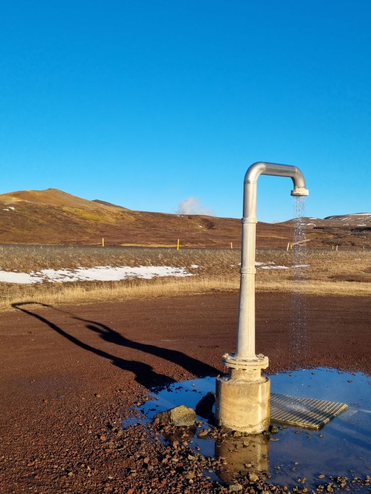Unweit des Hverir-Thermalfelds biegt die Straße Nr. 863 in Richtung Norden ab, ein Schild weißt auf die Krafla-Vulkan-Region hin. Nach wenigen Kilometern liegt rechts eine „ewige Dusche„, die kontinuierlich warmes Thermalwasser nach oben fördert. Und tatsächlich duscht sich auch bei unserem Besuch ein Camper im angenehm warmen Wasser, bei zwei Grad Außentemperatur. Sehr lustig, was es hier alles gibt!