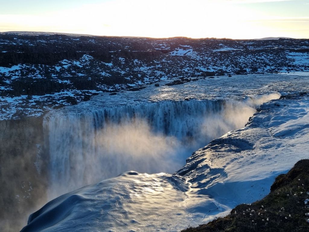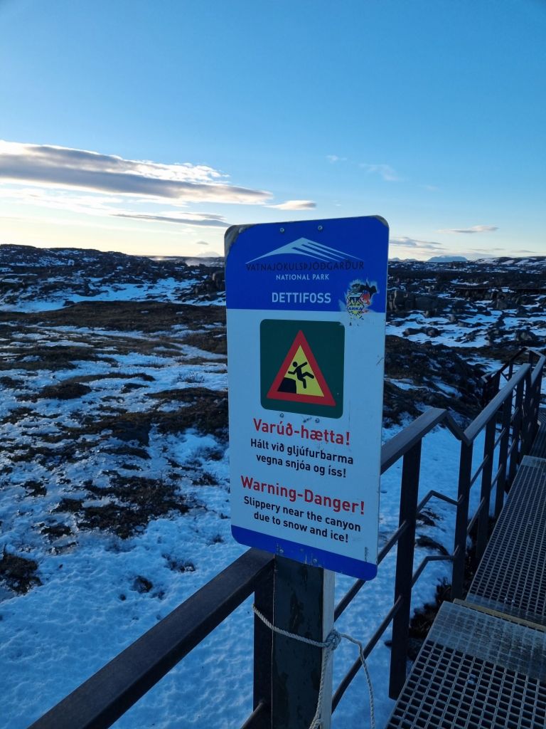 Vom Myvatn aus lässt sich auch eine weitere, nicht-vulkanische, Attraktion besuchen: der Dettifoss. Dieser wörtlich übersetzt „stürzende Wasserfall“ zählt du den schüttungsreichsten Europas: Auf etwa 100 Metern Breite stürzen die Wassermassen 44 Meter in die Tiefe, im Sommer etwa 1.500 Kubikmeter Wasser pro Sekunde. Die westliche Seite des Wasserfalls ist in weniger als 45 Minuten von Reykjahlid aus über eine geteerte Straße zu erreichen, ein kostenloser Parkplatz samt Toiletten ist vorhanden. Der nur etwa 800 Meter lange Weg zum Wasserfall führt über eine felsig-steinig-sandige Lava-Hochfläche, die Strecke im Sommer durch Wind und Sandstürme, im Winter durch Vereisung mitunter eine Herausforderung. Wir stellen uns der Winter-Challenge und schlittern über die eisigen Flächen Richtung Aussichtsplattformen, wo ein Teil der Wege entlang des Canyons aufgrund der Witterung dann auch gesperrt ist. Der Wasserfall mit seinen tosenden Massen ist imposant, allerdings haben uns der Godafoss sowie andere Wasserfälle auf Island (siehe Island: Insel der spektakulären Wasserfälle) mehr begeistert. Nichtsdestotrotz lohnt auch der Dettifoss zweifelsohne einen Besuch!