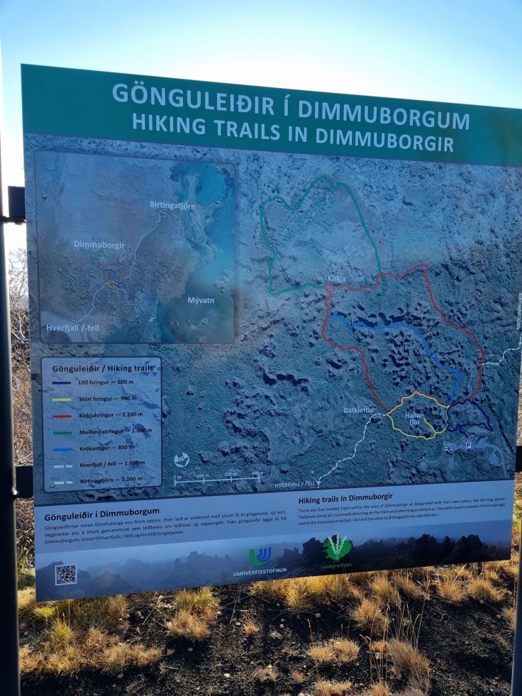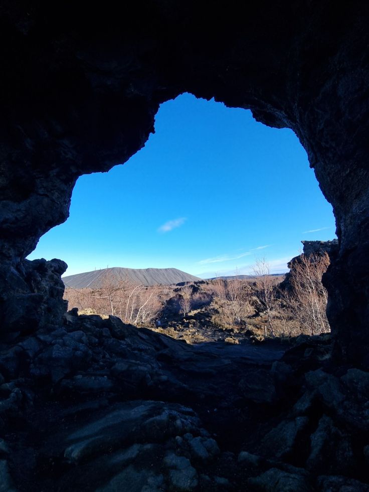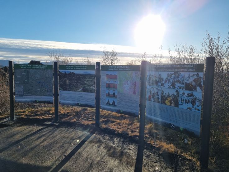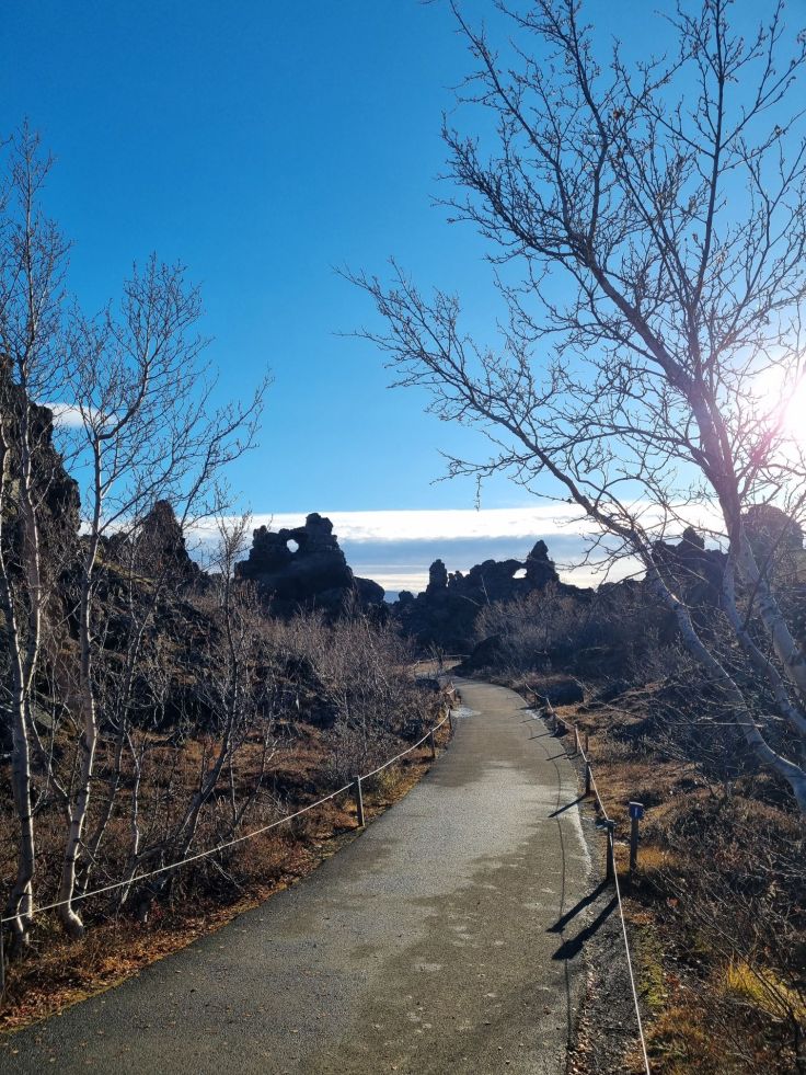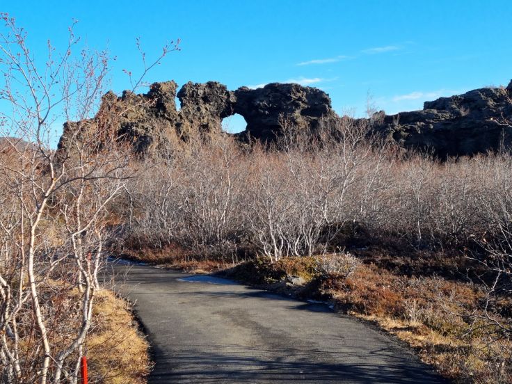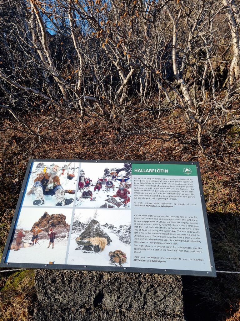 Unsere nächste Station ist das Lavafeld Dimmuborgir. Von einem Aussichtspunkt unweit des Parkplatzes sehen wir den Myvatn mit seinen zahlreichen Inseln, Halbinseln und Kratern, die durch das explosive Zusammentreffen von Lava und Wasser entstanden sind. Einmal umgedreht und blicken wir auf den vulkanischen Explosionskrater Hverfjall, den man auch besteigen kann. Unterhalb des Hverfjall liegt das Gebiet Dimmuborgir (deutsch „dunkle Burgen“), das durch einige kürzere und längere Wanderwege gut erschlossen ist. Es macht Spaß, durch die Wälder aus Zwerg- oder Moorbirken und die reizvollen Tuffsteinformationen zu laufen! In dieser „märchenhaften“ Welt wundert es uns nicht, dass wir – typisch isländisch – unterwegs auch über die „Yule Lads“ stolpern. Das sind eine Art „Weihnachts-Trolle“, von denen es auf Island 13 Stück gibt und sie sollen in Dimmuborgir wohnen. Können wir uns gut vorstellen!