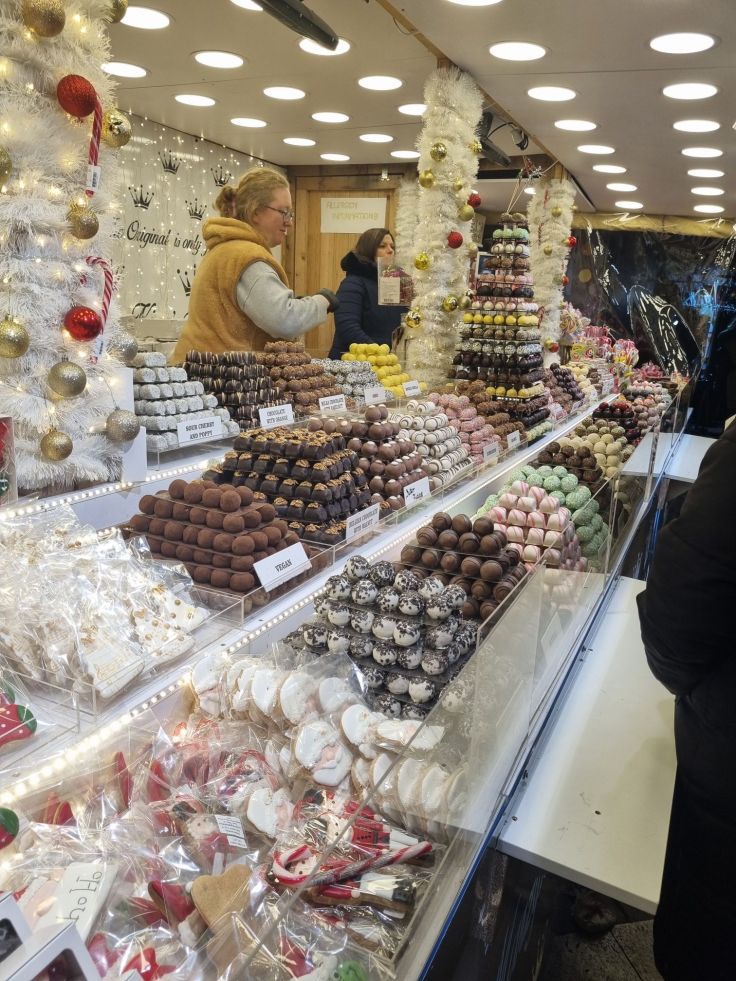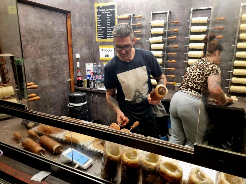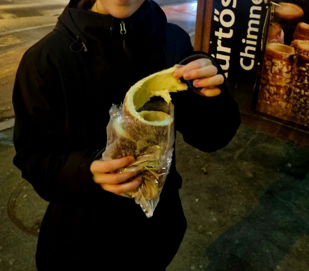 Wer Süßes sucht, wird im ganzen Stadtgebiet Baumstriezel / Chimney Cakes / Kürtöskalács finden. Dabei handelt es sich um Hefeteig, der um eine spezielle Form gewickelt und auf offenem Feuer gebacken wird. Er kann wahlweise mit Zucker und Zimt (traditionell), aber auch mit Nüssen, Schokolade, Mohn etc. gegegessen werden. Neuester Schrei auch in Budapest: Der Pistazien-Dubai-Kürtöskalács für den doppelten Preis, versteht sich … A propos Preis: An den Ständen, die ganzjährig in der ganzen Stadt verteilt zu finden sind, kostet ein Baumstriezel 1.000 HUF (ca. 2,50 Euro), auf dem Weihnachtsmarkt das zwei- bis dreifache. Damit noch mehr Geld damit verdient werden kann, werden die Striezel in stationären Chimney Cake Shops auch noch gefüllt angeboten. Wir waren mit der einfachen Variante vom Kiosk um die Ecke absolut glücklich!