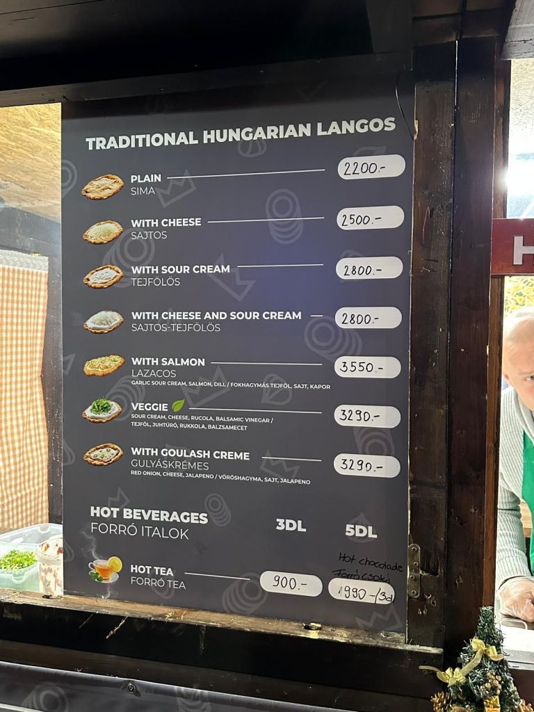 Ebenfalls hierzulande bereits vielen bekannt ist die ungarische Spezialität Lángos, ein Hefeteig-Fladen, der in Fett gebacken wird. Nach dem Abtropfen wird er traditionell mit Knoblauchöl bestrichen und/oder mit geriebenem Käse, Sauerrahm oder Letscho (ein Zwiebel-Paprika-Tomatengemisch) belegt, in der modernen Variante auch mit diversem Salat, Gemüse, Lachs etc. Auch Lángos ist auf jedem Weihnachtsmarkt zu haben, die bei uns häufig anzutreffende süße Variante (z. B. mit Zucker und Zimt) haben wir hingegen so gut wie nie gesehen.
