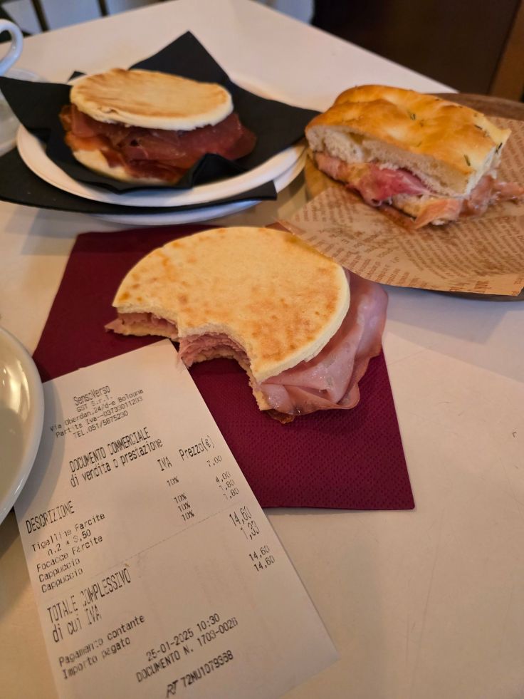 Wir nehmen unsere Mortadella, Salame rosa und eine weitere regionale Spezialität Parmaschinken (Parma ist etwa 100 Kilometer entfernt), am Tresen einer der vielen jungen Bars, dem SensoVerso (Via Guglielmo Oberdan), ein. Wie es sich hier gehört, in einer weiteren hiesigen Spezialität, den Tigelle. Diese kleinen, weichen Fladenbrote werden warm serviert und sind ein typisches Streetfood in Bologna und Modena, werden oft aber auch als Vorspeise angeboten. Wer eine ganze Bandbreite von ihnen testen will, kann dies auch in der Tigelleria Tigellino (Via Calzolerie) tun.