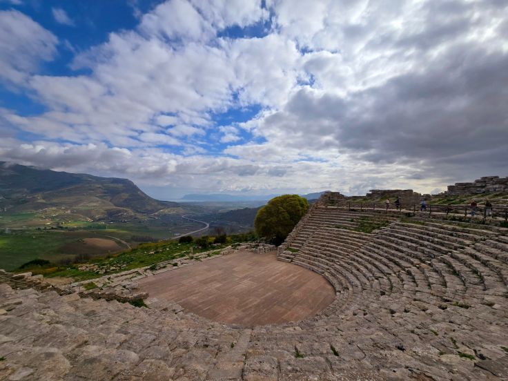 Nicht weniger beeindruckend als der Tempel ist das Amphitheater von Segesta. Das Theater ist jünger als der Tempel, wurde später unter römischer Herrschaft umgebaut, vor einigen Jahren renoviert und noch heute für Veranstaltungen genutzt. Es liegt etwa 300 Meter über dem Meeresspiegel und von hier aus haben wir einen traumhaften Ausblick über den Golf von Castellammare (inklusive der Autobahn nach Trapani).