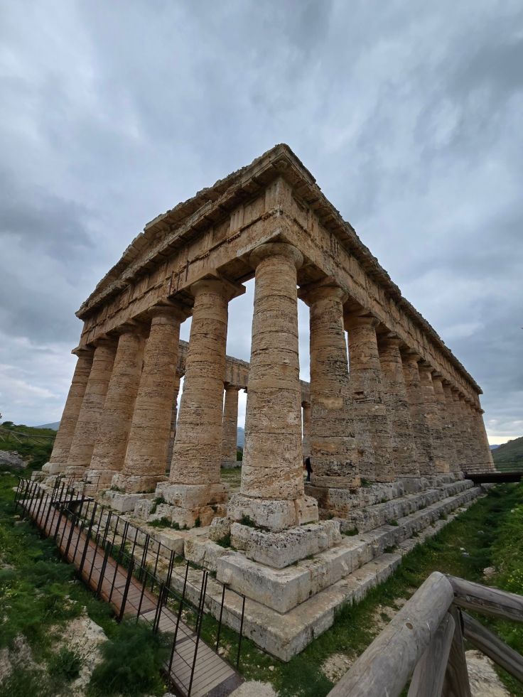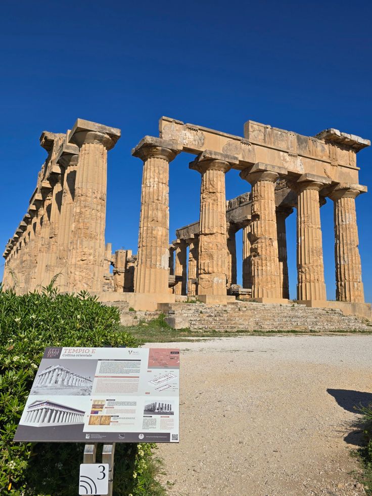 Entgegen der Empfehlung des Audioguide laufen wir zuerst die kurze Strecke zum dorischen Tempel den Berg hinauf. Er wurde Ende des 5. Jahrhunderts v. Chr. im Stil der klassischen Architektur griechischer Städte auf Sizilien erbaut (höchst ungewöhnlich für die Elymer), umfasst 6 auf 14 Säulen und ist sehr gut erhalten. Dies könnte zum einen an seiner relativen Abgelegenheit liegen, die eine Nutzung der Tempelsteine als Steinreservoir verhinderten. Ein weiterer Grund könnte sein, dass der niemals geweihte, weil nie fertiggestellte Tempel, nicht entweiht werden konnte. Dieser unfertige Zustand ist an den Säulen zu erkennen, die noch eine transportbedingte Schutzschicht aufweisen. Außerdem sind an den Stufen des Sockels noch Steinnasen sichtbar, die ebenfalls später abgeschlagen worden wären. Es wird vermutet, dass kriegerische Auseinandersetzungen seine Fertigstellung verhinderten.