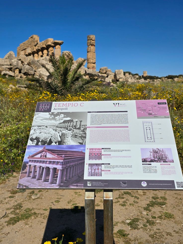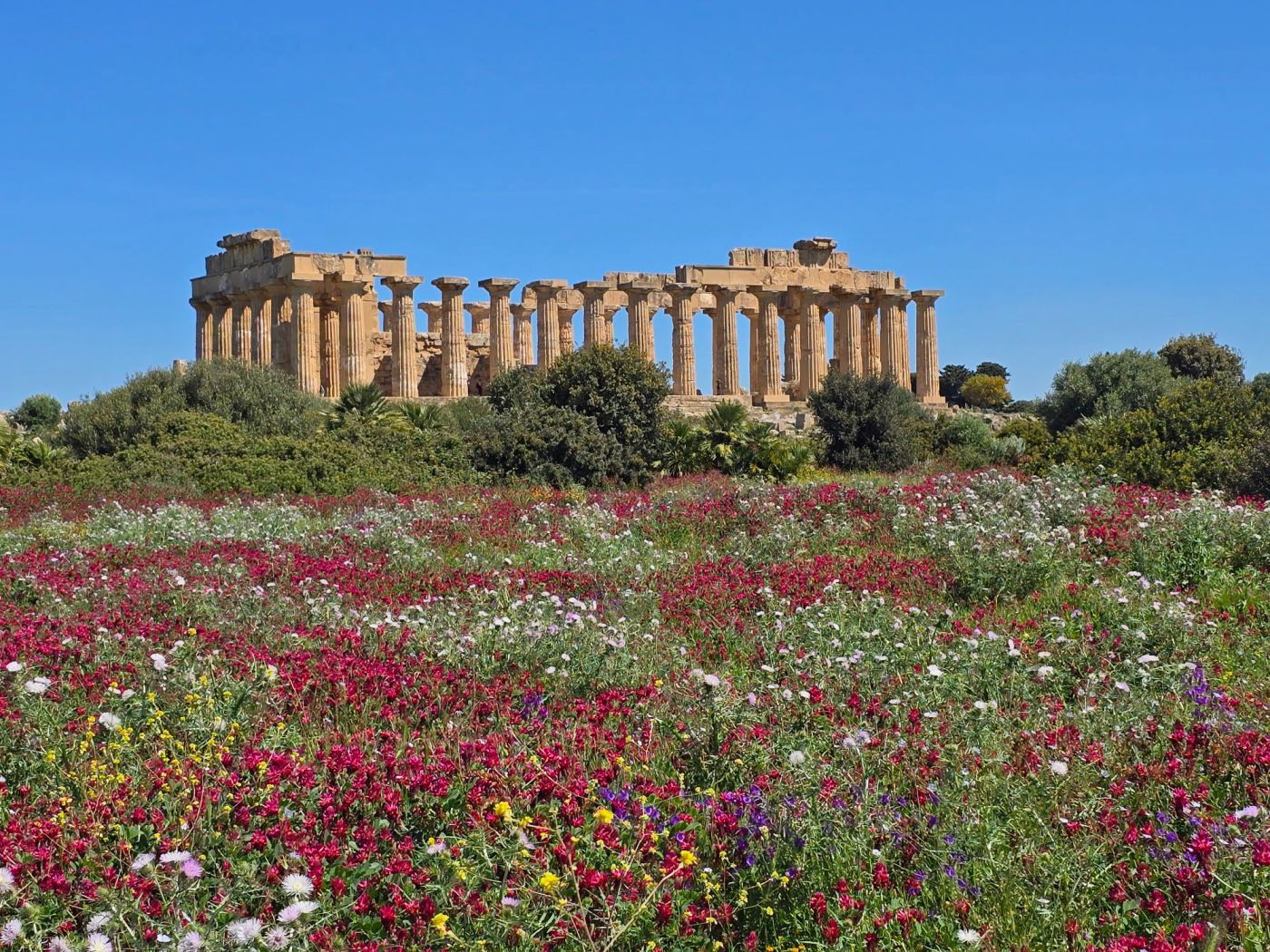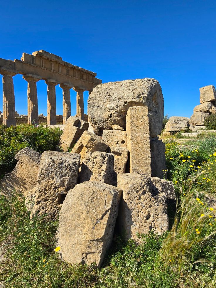 Unweit des Haupteingangs liegt weithin sichtbar das Wahrzeichen von Selinunt, der Tempel E. Er wurde als einziger nach dem 2. Weltkrieg wieder komplett aufgebaut, die Rekonstruktion ist allerdings umstritten. Dafür liegt auch er derzeit wunderhübsch inmitten eines Blumenmeers und bietet dazu noch Ausblick auf das tiefblaue Mittelmeer!