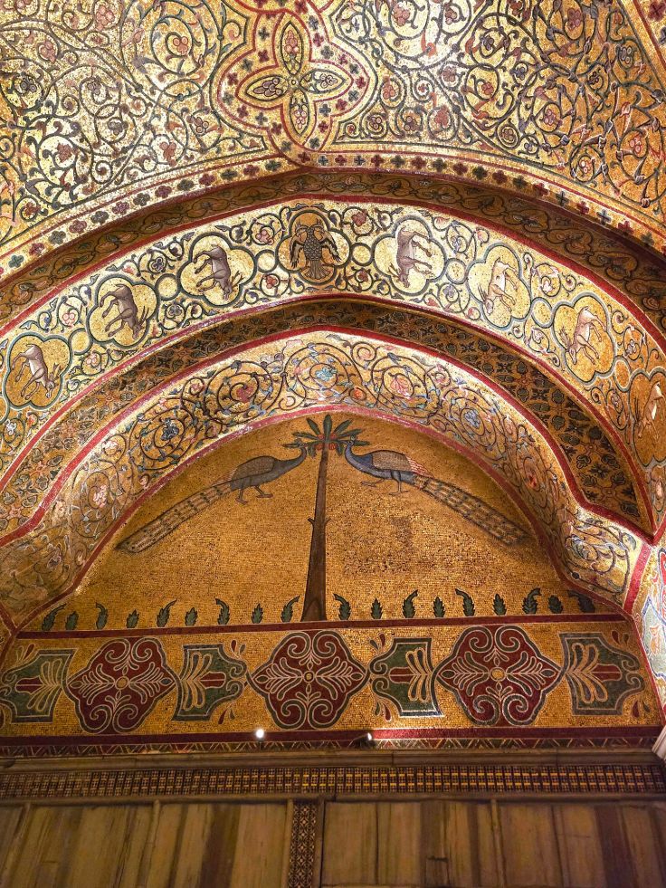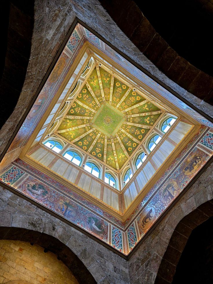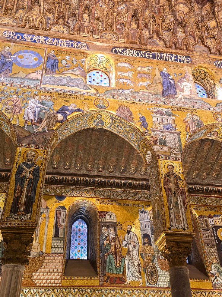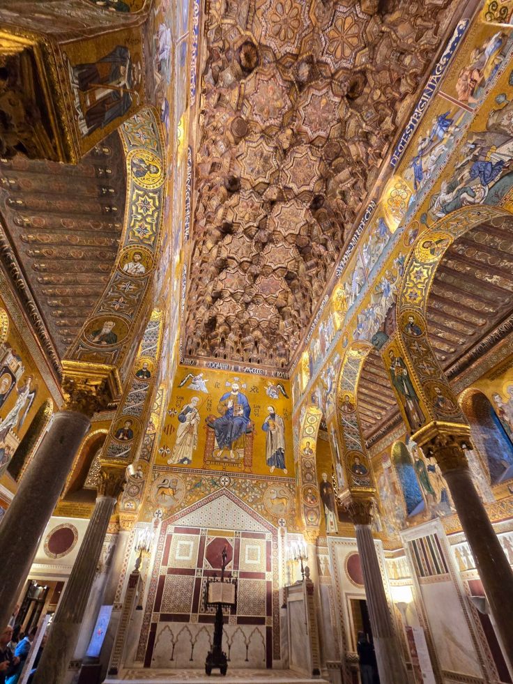 Der Publikumsmagnet schlechthin ist – zurecht – die Cappella Palatina, vor deren Eingang sich meist eine Schlange bildet. Diese Hofkapelle wurde von König Roger II im arabisch-byzantinisch-normannischen Stil errichtet und sie steht im deutlichen Gegensatz zu den eher nüchtern wirkenden, festungsähnlichen Außenmauern des Palazzo. Sie ist ein wahres Schatzkästchen, selbst wenn sie wie zurzeit in Teilen renoviert wird (Stand April 2025). Schon an der Außenwand bewundern wir während unserer Wartezeit die prächtigen Mosaiken. Das Innere ist noch beeindruckender, unzählige Mosaike aus Gold, Silber, Glas, Marmor und Serpentin sowie eine wunderschön geschnitzte Holzdecke zieren die Kapelle. Doch nicht allein diese Pracht macht die Cappella Palatina zu etwas Besonderem, sondern auch eine Botschaft, die aktueller ist den je. Der Normanne Roger, selbst fremd in diesem Land, war Herrscher über einen Vielvölkerstaat, unter anderem aus Nachkommen der Erymer, aus Griechen, Arabern und Juden. Er wollte alle Untertanen ansprechen und so ließ er in seiner Kapelle vor allem lateinische, aber auch griechische und arabische Inschriften anbringen. Die im Vordergrund stehende biblische Bildsprache mit Christus als Mittelpunkt und Weltherrscher wird durch Mosaiken im byzantinischen Stil dargestellt und insbesondere in der Holzdecke finden sich arabische Ornamente und Handwerkskunst, für die der König nordafrikanische Handwerker verpflichtete. Und so ist seine Kapelle auch ein Symbol der Toleranz zwischen den Völkern!