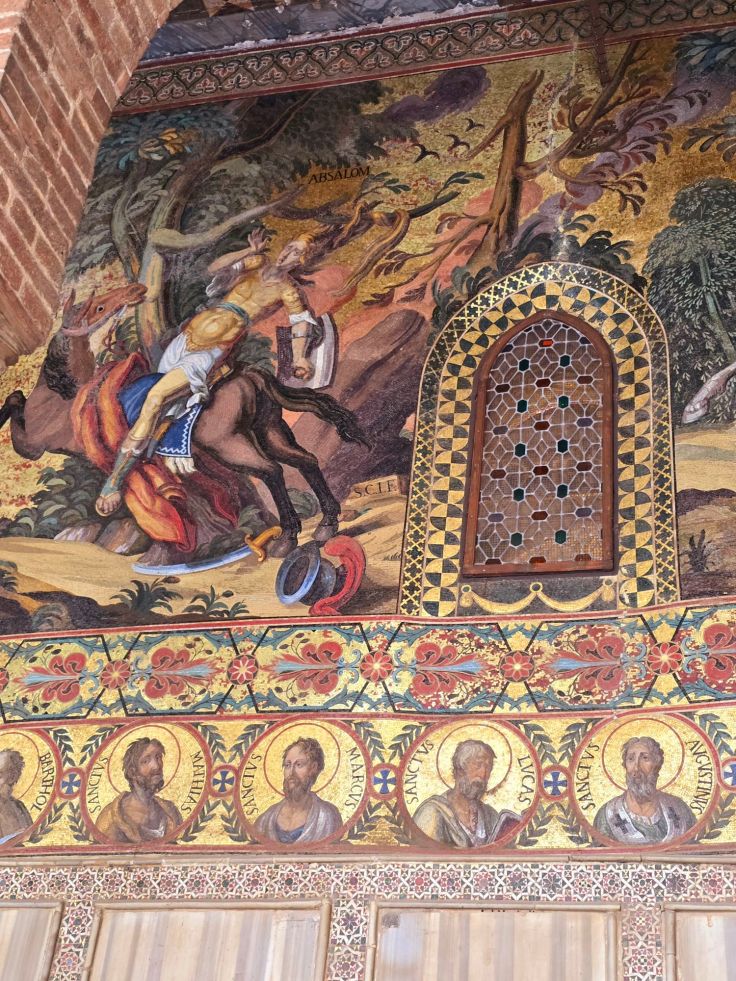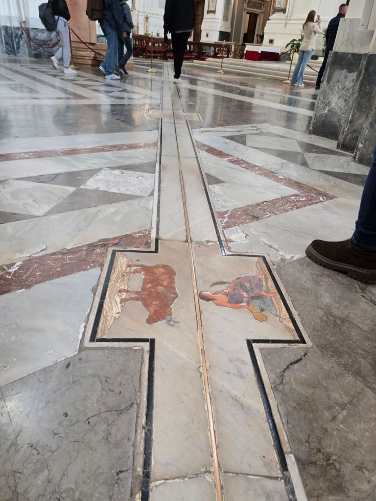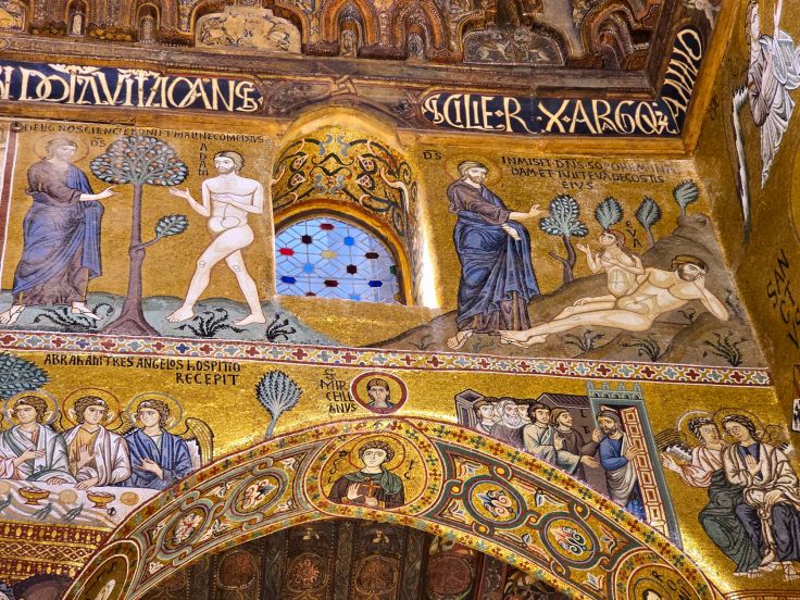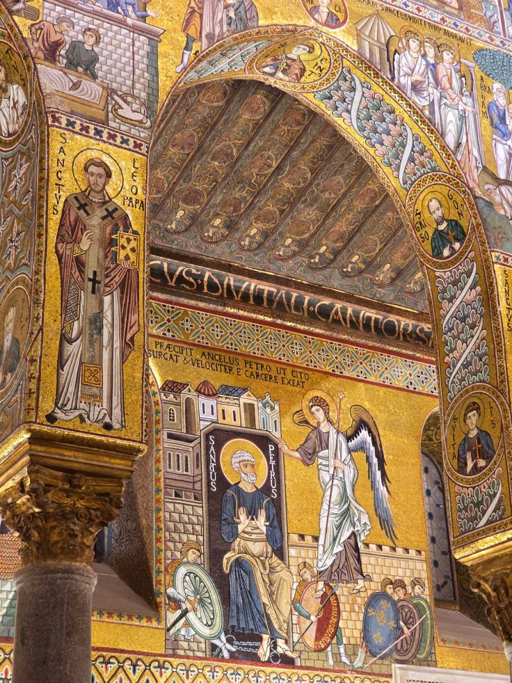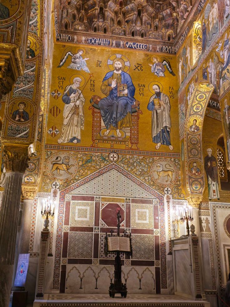 Der Publikumsmagnet schlechthin ist – zurecht – die Cappella Palatina, vor deren Eingang sich meist eine Schlange bildet. Diese Hofkapelle wurde von König Roger II im arabisch-byzantinisch-normannischen Stil errichtet und sie steht im deutlichen Gegensatz zu den eher nüchtern wirkenden, festungsähnlichen Außenmauern des Palazzo. Sie ist ein wahres Schatzkästchen, selbst wenn sie wie zurzeit in Teilen renoviert wird (Stand April 2025). Schon an der Außenwand bewundern wir während unserer Wartezeit die prächtigen Mosaiken. Das Innere ist noch beeindruckender, unzählige Mosaike aus Gold, Silber, Glas, Marmor und Serpentin sowie eine wunderschön geschnitzte Holzdecke zieren die Kapelle. Doch nicht allein diese Pracht macht die Cappella Palatina zu etwas Besonderem, sondern auch eine Botschaft, die aktueller ist den je. Der Normanne Roger, selbst fremd in diesem Land, war Herrscher über einen Vielvölkerstaat, unter anderem aus Nachkommen der Erymer, aus Griechen, Arabern und Juden. Er wollte alle Untertanen ansprechen und so ließ er in seiner Kapelle vor allem lateinische, aber auch griechische und arabische Inschriften anbringen. Die im Vordergrund stehende biblische Bildsprache mit Christus als Mittelpunkt und Weltherrscher wird durch Mosaiken im byzantinischen Stil dargestellt und insbesondere in der Holzdecke finden sich arabische Ornamente und Handwerkskunst, für die der König nordafrikanische Handwerker verpflichtete. Und so ist seine Kapelle auch ein Symbol der Toleranz zwischen den Völkern!