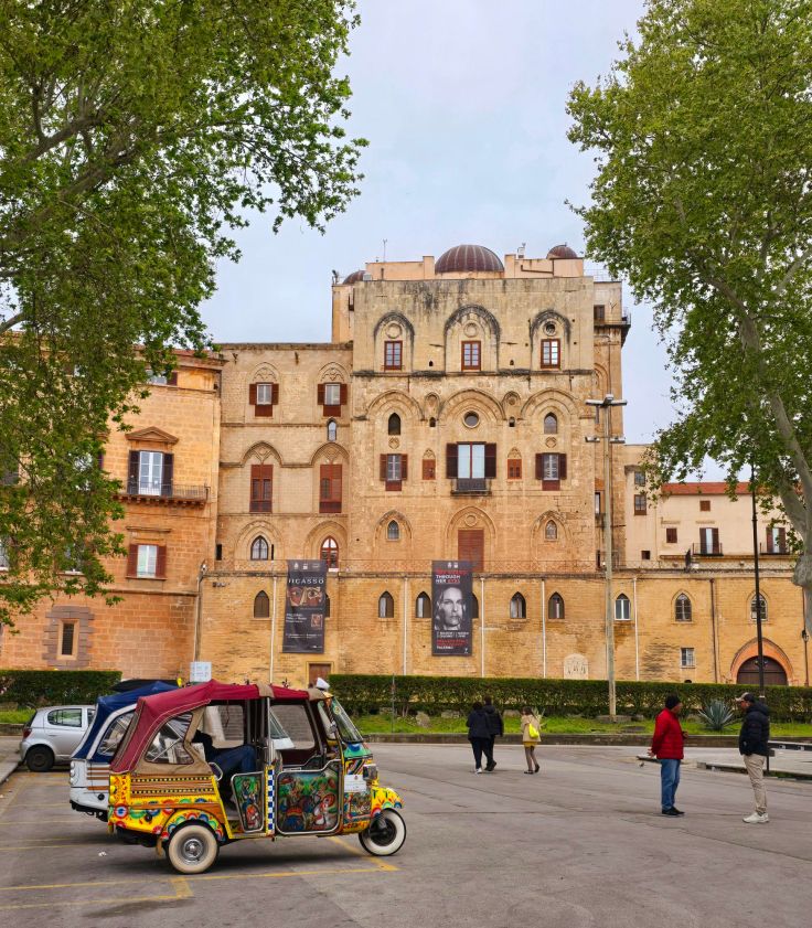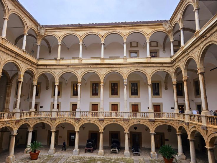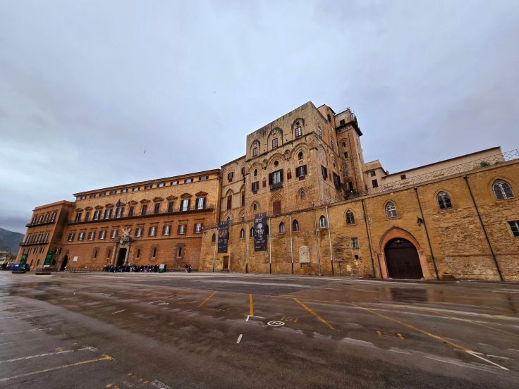An unserem Besuchstag montags können wir uns die gesamten Räumlichkeiten anschauen. Dazu zählen besagte Sitzungsräume und die prunkvollen königlichen Gemächer von König Roger II mit Goldmosaiken, die königlichen Gärten, eine Sonderausstellung (bei unserem Besuch zu Picasso) und unter dem Palast liegende antike Stadtmauern und Ausgrabungen aus punischer und römischer Zeit.