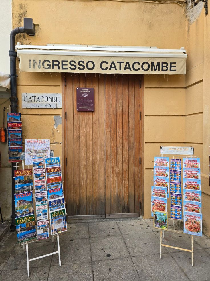 Derart weitergebildet und gut gestärkt machen wir uns auf zur Kapuzinergruft, die unterhalb des Kapuzinerklosters liegt. Tickets können direkt vor Ort (nicht online) erworben werden (Toilette ist im Eingangsbereich vorhanden). In der weitläufigen unterirdischen Anlage sind zahlreiche nahezu natürlicherweise entstandene Mumien zu sehen. Insgesamt sind es über 2.000, viele stehend bzw. hängend, manche auch liegend und nur wenige in Särgen. Die älteste Mumie datiert vom Ende des 16. Jahrhunderts, die meisten aus dem 17. bis 19. Jahrhundert (später wurde dieser Brauch verboten bzw. es durfte hier nur noch mit Särgen bestattet werden). Zunächst wurden hier nur Mönche bestattet, später auch wohlhabende Bürger der Stadt, von denen viele den Orden finanziell unterstützten. Die Mumien stehen größtenteils „sortiert“ in den Korridoren, nach Kapuzinern und die Priestern, den „Professionisti“ (also Ärzte, Autoren, Künstler, Offiziere – teils ist dies an der Kleidung erkennbar) und Frauen und Kinder. Der Zustand ist erstaunlich, die Körper sind teils extrem gut erhalten. Die Mumifizierung erfolgte vor allem durch ein monatelanges Austrocknen der Toten in speziellen Räumen. Danach wurden sie mit Essig gewaschen, der Oberkörper mit Stroh ausgefüllt und sie mit den ausgesuchten Kleidern angezogen. Nachgeholfen mit konservierenden Stoffen wurde lediglich bei einer der bekanntesten Mumien, der knapp zweijährigen Rosalia Lombardo, weshalb sie extrem gut erhalten ist. Fotografieren ist aus Respekt vor den Toten verboten (wer googelt, wird schnell fündig). Ziel war es, den Besuchern ihre Vergänglichkeit vor Augen zu führen, eindrücklich ist dieser Besuch auf jeden Fall.