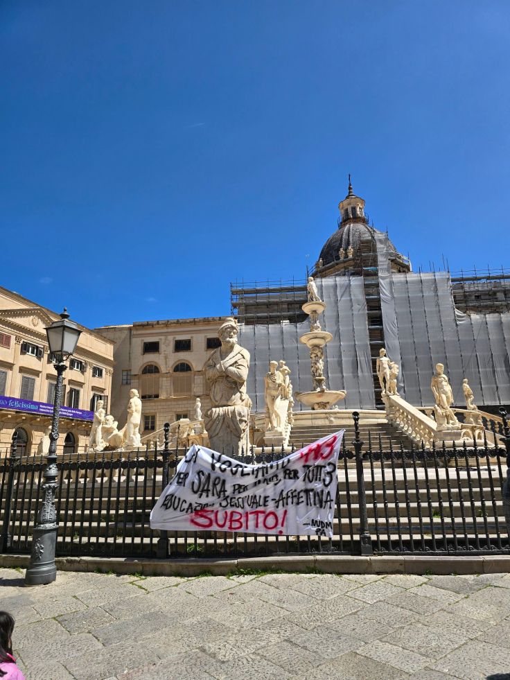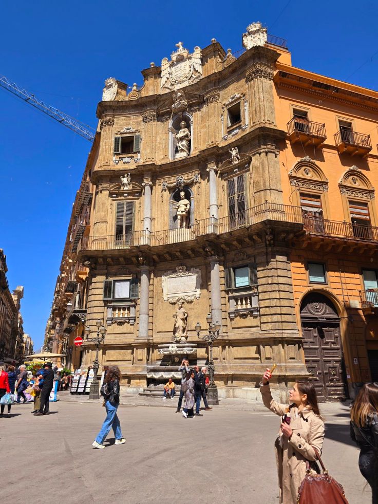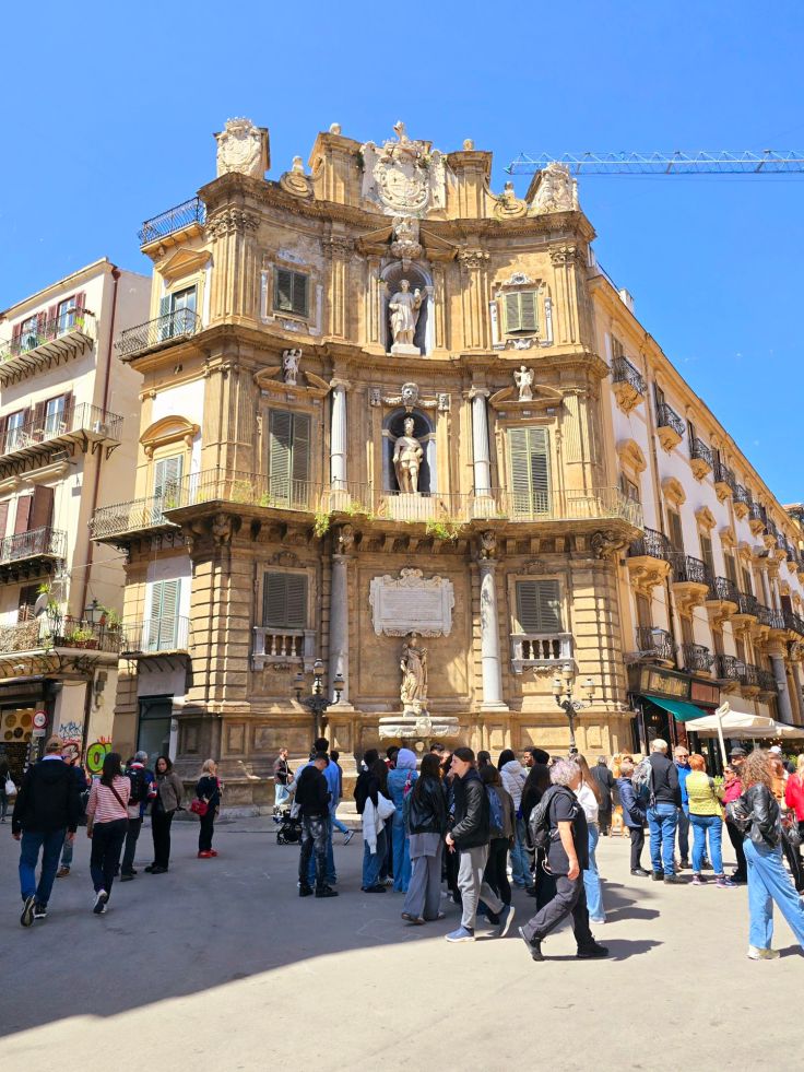 Von der Kathedrale aus bewegen sich die Besucherströme der Shopping- und Restaurantmeile Via Vittorio Emanuele entlang bis zu einem weiteren Touristenmagnet: den Quattro Canti. Dabei handelt es sich um vier Barockhäuser an der Straßenkreuzung der Vittorio Emanuele mit der Via Maqueda (der offizielle Platzname lautet Piazza Vigliena). Diese zwei Straßen teilen die Altstadt in vier Viertel. Je eines der Häuser bildet das „Eingangstor“ für eines der Viertel und steht für eine Jahreszeit, in den Fassaden finden sich jeweils die Schutzpatronin des Viertels (oben), darunter ein spanischer König und unten ein Brunnen. Zweifelsohne ist das Barockensemble sehr sehenswert, doch mindestens ebenso unterhaltsam ist es zu beobachten, wie die Instagrammer versuchen, per Weitwinkel mit auf dem Boden liegenden Smartphones alle vier Häuser einzufangen. In unmittelbarer Nähe liegt die Piazza Pretoria mit dem gleichnamigen Brunnen, Fontana Pretoria. Die größtenteils nackten Figuren sorgten in der Vergangenheit für viel Irritation und den Beinamen „Brunnen der Schande“, heute stört sich keiner mehr daran. Die tollen Fotos, die ihr von dem Brunnen finden werdet, sind von oben entstanden. Denn der Brunnen ist eingezäunt (und momentan auch noch mit Baugerüsten im Hintergrund), aus normaler Perspektive können kaum gute Fotos gemacht werden.