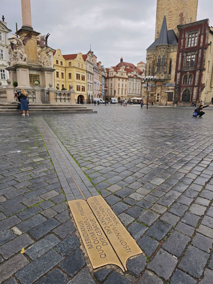 Von der Karlsbrücke gelangen wir unter dem Altstädter Brückenturm hindurch in die Prager Altstadt, zu einem weiteren Wahrzeichen der Stadt: dem gotischen Altstädter Rathaus, wie die Karlsbrücke ursprünglich im 14. Jahrhundert erbaut. Für die Tschechen ist es eine Art Nationalheiligtum, denn es ist nicht nur das älteste Rathaus des Landes und Symbol der Selbstverwaltung, sondern es gilt auch als Ausdruck der tschechischen Widerstandsbewegung gegen den Nationalsozialismus. Der Prager Aufstand wurde von hier aus organisiert, weshalb es auch durch Granatenbeschuss nahezu vollständig zerstört wurde. Doch vor diesem geschichtlichen Hintergrund erstaunt es nicht, dass die Prager ihre Ikone wieder originalgetreu aufgebaut haben. Zu jeder vollen Stunde versammeln unter der Rathausuhr unzählige Touristen, um den Vorbeimarsch der zwölf Apostel zu bewundern. Wie die Stadt selbst (siehe: Zwei Tage in Prag – Stadt der vielen Namen) trägt auch diese Uhr zahlreiche Namen: neben Rathausuhr wird sie auch Altstädter Astronomische Uhr oder Aposteluhr genannt, gemeint ist immer dieselbe. Das Schauspiel ist kurz und am Interessantesten für uns der glockenziehende Sensenmann. Spannender als die Apostelpolonaise ist die Uhr selbst mit ihren drei Zeigern: dem Sonnenzeiger, dem Mondzeiger und der Anzeige der Tierkreiszeichen. Irgendwie haben die Prager ein Faible für das Astronomische, scheint uns. Und dann „stolpern“ wir gleich auch noch über den Prager Meridian von 1652 auf dem Altstädter Ring zwischen der Mariensäule und der Statue von Jan Hus. Der Meridian diente der Messung der Mittagszeit und weicht nur eine Sekunde von der Messung der später installierten besagten Sonnenuhr im Klementinum ab – ich bin immer wieder begeistert, wie genau die Menschen schon in früheren Zeiten Naturphänomene messen konnten. Um das Rathaus herum stehen neben besagtem böhmischen Reformator Jan Hus zahlreiche ehemalige Kaufmannshäuser, auch sie hübsch herausgeputzt.