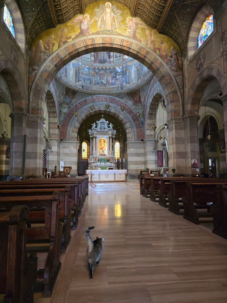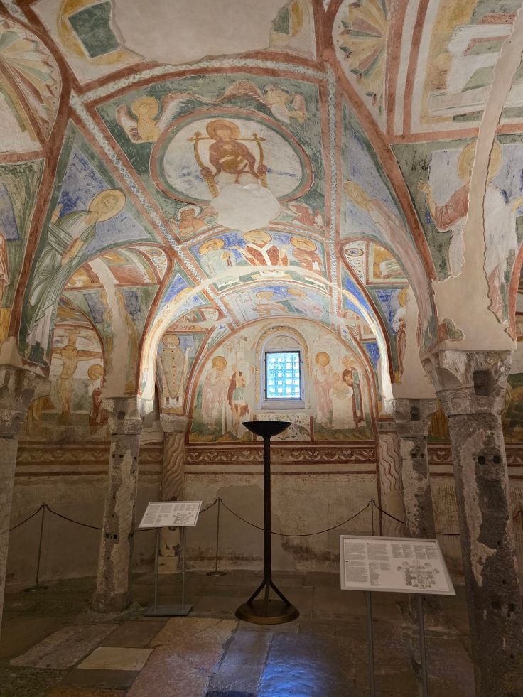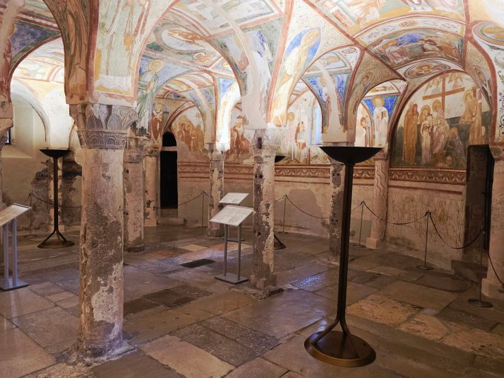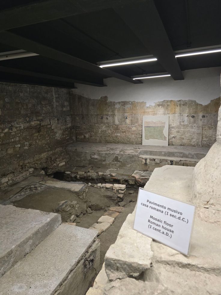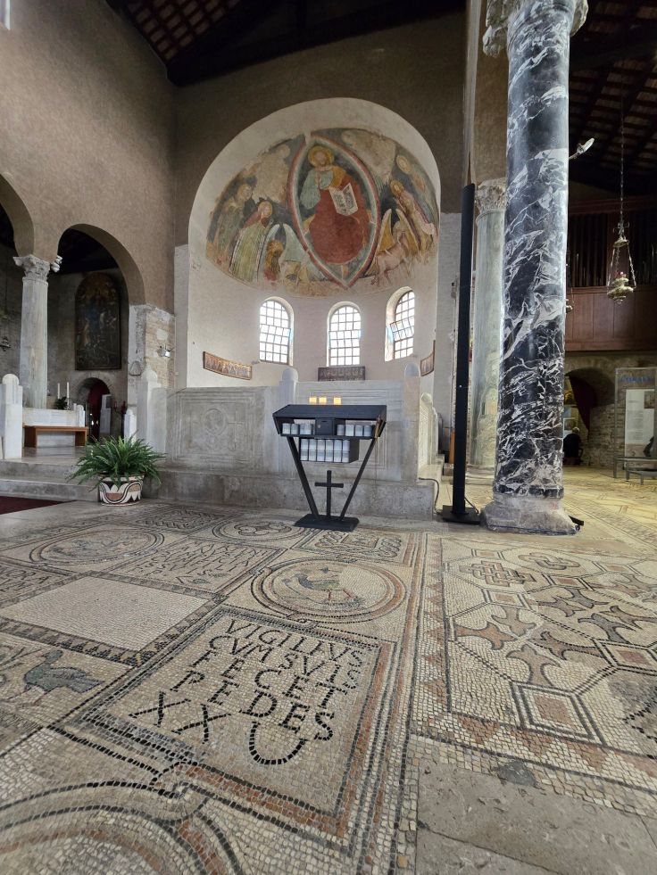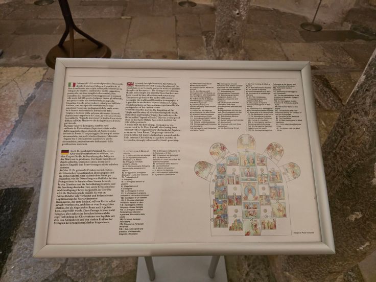 Meisterlich geht es auch unter der Erde weiter: in der Krypta unter dem Hauptaltar der Basilika. Sie wurde zur Zeit von Bischof Maxentius im 8. Jahrhundert errichtet – also wieder während einer anderen Phase – zur Aufbewahrung der Reliquien der Märtyrer von Aquileia: Hermagoras und Fortunatus. Die Wände schmücken wundervolle Fresken aus dem 12. Jahrhundert, dargestellt wird das Leiden Christi, die Legende des Evangelisten Markus und die Geschichte des Heiligen Hermagoras, des wie gesagt ersten Märtyrers von Aquileia. In einem weiteren unterirdischen Raum neben dem Hauptportal, in der Nähe der Gedenksteine anlässlich der Besuche diverser Päpste, finden sich weitere Mosaiken wie das Bild von ewigen Kampf des Hahns (=Licht) gegen die Schildkröte (=Schatten), außerdem Fußbodenmosaike römischer Villen, die noch älter sind als der Kirchen-Mosaikboden von Theodorus (1. Jh. n. Chr.), also vor der Kirche hier standen.