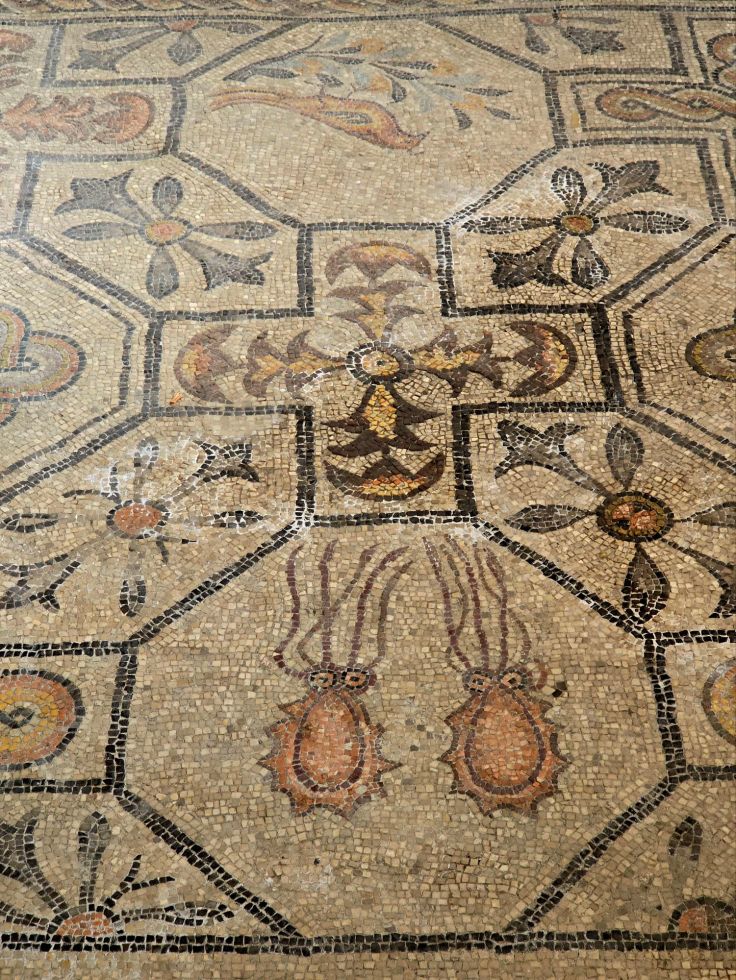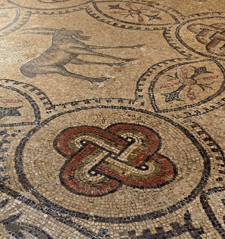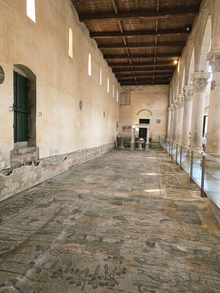 Von hier sind es nur ein paar Schritte zur absoluten Top-Attraktion von Aquileia: der (früh-)mittelalterlichen Basilika di Santa Maria Assunta (Eintritt wird erhoben, Tickets können vorab gekauft werden). In der heutigen Form wurde die Kirche 1031 durch Bischof Poppo geweiht. Mit ihrer klaren romanischen Form und dem Kampanile, umgeben von Zypressen, ist sie für mich schon von außen eine Augenweide. Und welche Pracht zeigt sich erst im Innern der Kirche. Hier ist zu sehen, was erst zu Beginn des 20. Jahrhunderts entdeckt und freigelegt wurde: das bedeutendste frühchristliche Fußbodenmosaik Italiens. Die größte und älteste Mosaik-Fläche stammt aus der Zeit von Bischofs Theodorus, datiert auf 313, nachdem die „Mailänder Vereinbarung“ den frühen Christen Religionsfreiheit zusagte. Später wurden die Mosaiken mit Erde bedeckt und der ca. einen halben Meter höhergelegte Boden bildete jahrhundertelang die begehbare Fläche der Kirche, was sich an den „höhergelegten Säulen“, der Tür und an den Seitenwänden sehr gut erkennen lässt. Das insgesamt 760 m² große Mosaik ist das größte Bodenmosaik des Weströmischen Reichs und was gibt es da nicht alles zu entdecken: unzählige Tier-, Pflanzen- und Menschenbildnisse, Antilopen, Sepien, Vögel, die Geschichte von Jona, verschiedene Ornamente und immer wieder der Salomonsknoten, Symbol für die Unendlichkeit und in seinen drei Farben auch für die Dreifaltigkeit. Anhand eines Salomonsknotens wird der Aufbau des Fundaments und die Arbeitsweise der Künstler erklärt. Die verwendeten Steine sind übrigens nicht bemalt, sondern entsprechend ihrer natürlichen Farbe ausgewählt. Ein absolut großartiges, fast 2.000 Jahre altes Meisterwerk!