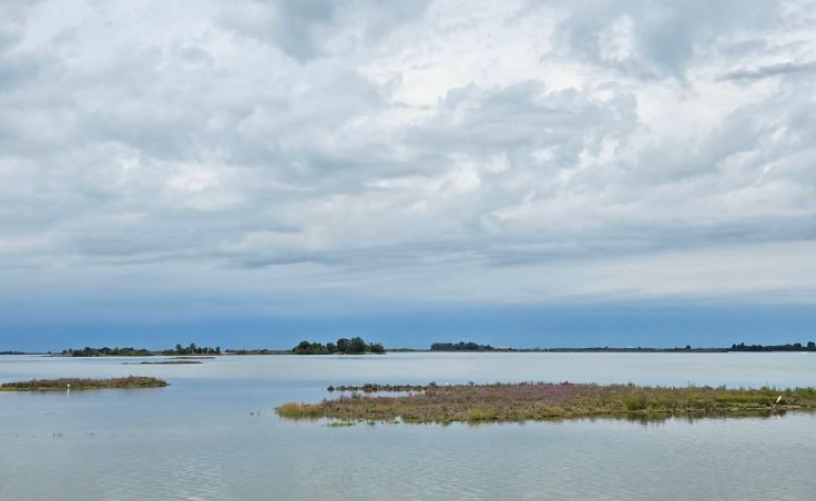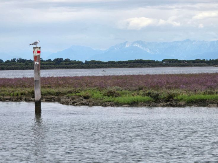 Mit Sonneninseln im adriatischen Golf vor Venedig haben wir gute Erfahrungen gemacht (siehe Albarella: endlich Frühling!), also hatten wir auch an die Sonneninsel Grado gewisse Erwartungen. Wie Albarella südlich von Venedig ist auch Grado durch einen Damm mit dem Festland verbunden, vier Kilometer lang ist diese Straße durch die Lagune. Schon bei der Fahrt auf diesem Damm erschließt sich die Schönheit der Lagunenlandschaft mit ihren unzähligen Inselchen, im Meer schaukelnden Booten und zahlreichen Wasservögeln. Auf halber Strecke begrüßen uns zwei imposante Pinien, willkommene Schattenspender für die vielen Radfahrer entlang des Alpe-Adria-Radwegs, der in Grado endet.
