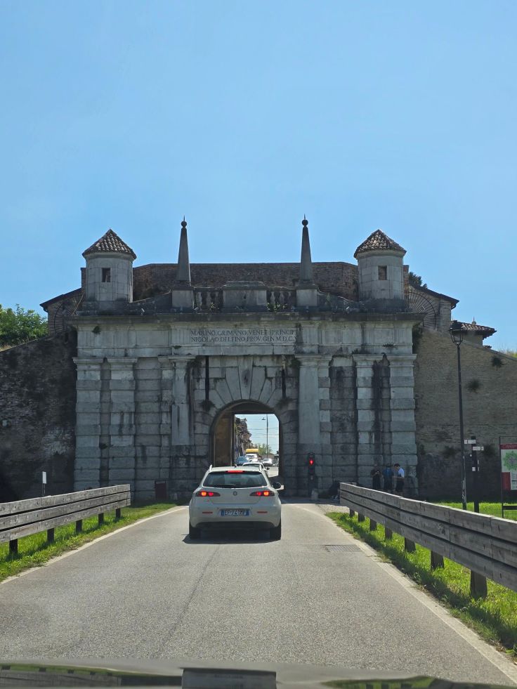 Ein weiteres besonderes Städtchen im Hinterland von Grado ist Palmanova, die sternförmige Stadt, die ebenfalls zum UNESCO-Weltkulturerbe zählt. Sie wurde im 16. Jahrhundert als geplante Festungsstadt mit drei Festungsringen von venezianischen Bauherrn zum Schutz vor türkischer Invasion angelegt. Das sternförmige Stadtbild zeigt sich eindrucksvoll auf Luftbildern und bringt eine gewisse Komik für Autofahrer mit sich, die im Zick-Zack-Kurs entlang einiger der neun Zacken der äußersten Stadtmauern fahren müssen. Außerhalb der Vogelperspektive, sprich: am Boden, fand ich Palmanova nicht so berauschend. Natürlich ist der radiale Straßengrundriss gut zu sehen und alles führt auf den zentralen, aber für mich überdimensioniert wirkenden, ehemaligen Exerzier-Platz. Der wird zum Zeitpunkt unseres Besuchs sinnigerweise für sommerliche Konzerte benutzt, an unserem Tag war Gigi d’Agostino zu Gast. Ohne die Konzertinfrastruktur würde fast gähnende Leere herrschen – und wir haben Hochsaison. Empfehlen kann ich das etwas abseits des Hauptplatzes liegende Terra Madre Bistrot und Feinkostgeschäft mit zahlreichen regionalen Spezialitäten. Und alle, die mal so richtig ausgiebig shoppen wollen, können dies im benachbarten Outlet Palmanova Village tun.